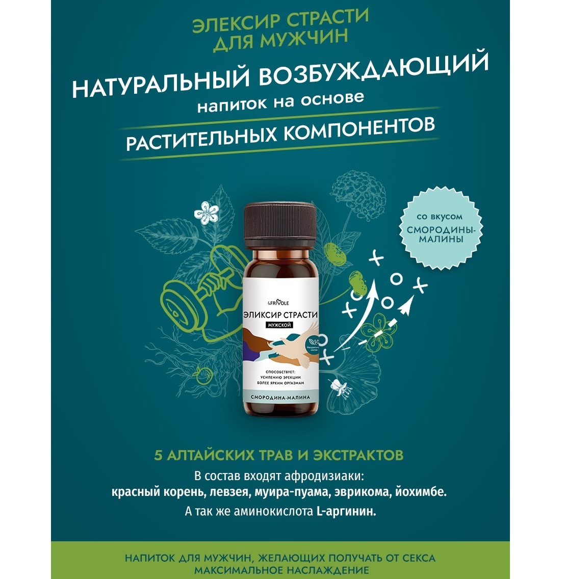 Эликсир страсти Le Frivole — это не просто напиток, это ваш верный помощник в мире интимных удовольствий. Он создан для мужчин, которые хотят получать от секса максимальное наслаждение. Натуральные компоненты обеспечивают безопасность и эффективность, а уникальный вкус смородины и малины добавляет приятные нотки в ваше времяпрепровождение.