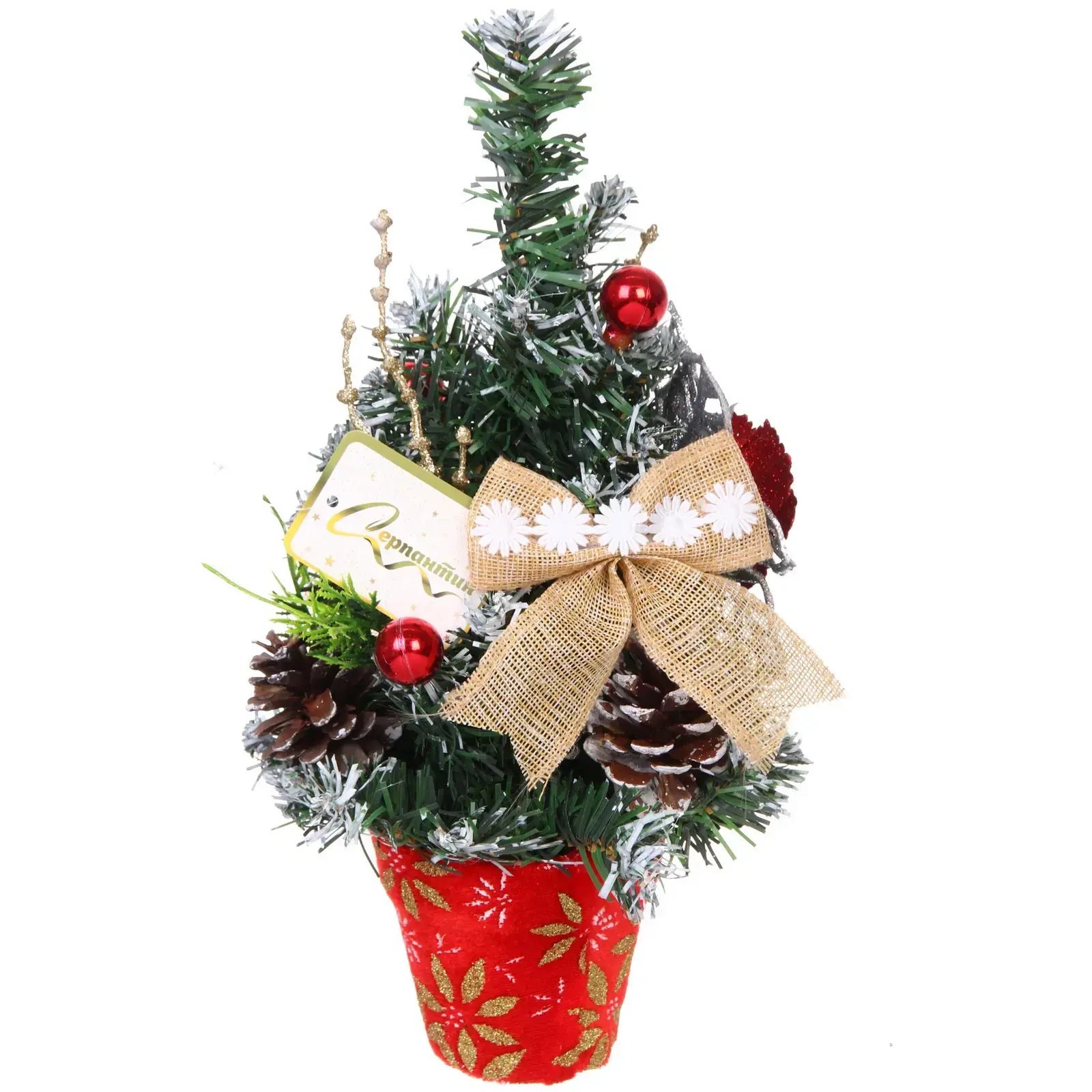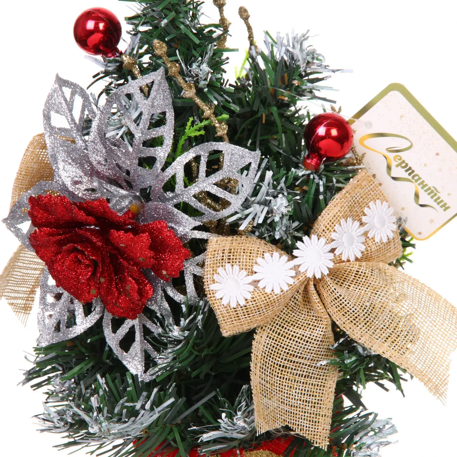 Эта декоративная елка высотой 30 см станет идеальным украшением для вашего дома в праздничный сезон. Она выполнена из качественных материалов, что гарантирует долговечность и надежность. Елка украшена красными шариками, блестящими серебристыми листьями и золотыми лентами, что придаёт ей особый шарм и элегантность. С ней вы сможете легко создать атмосферу уюта и радости, которая так важна в новогодние праздники.