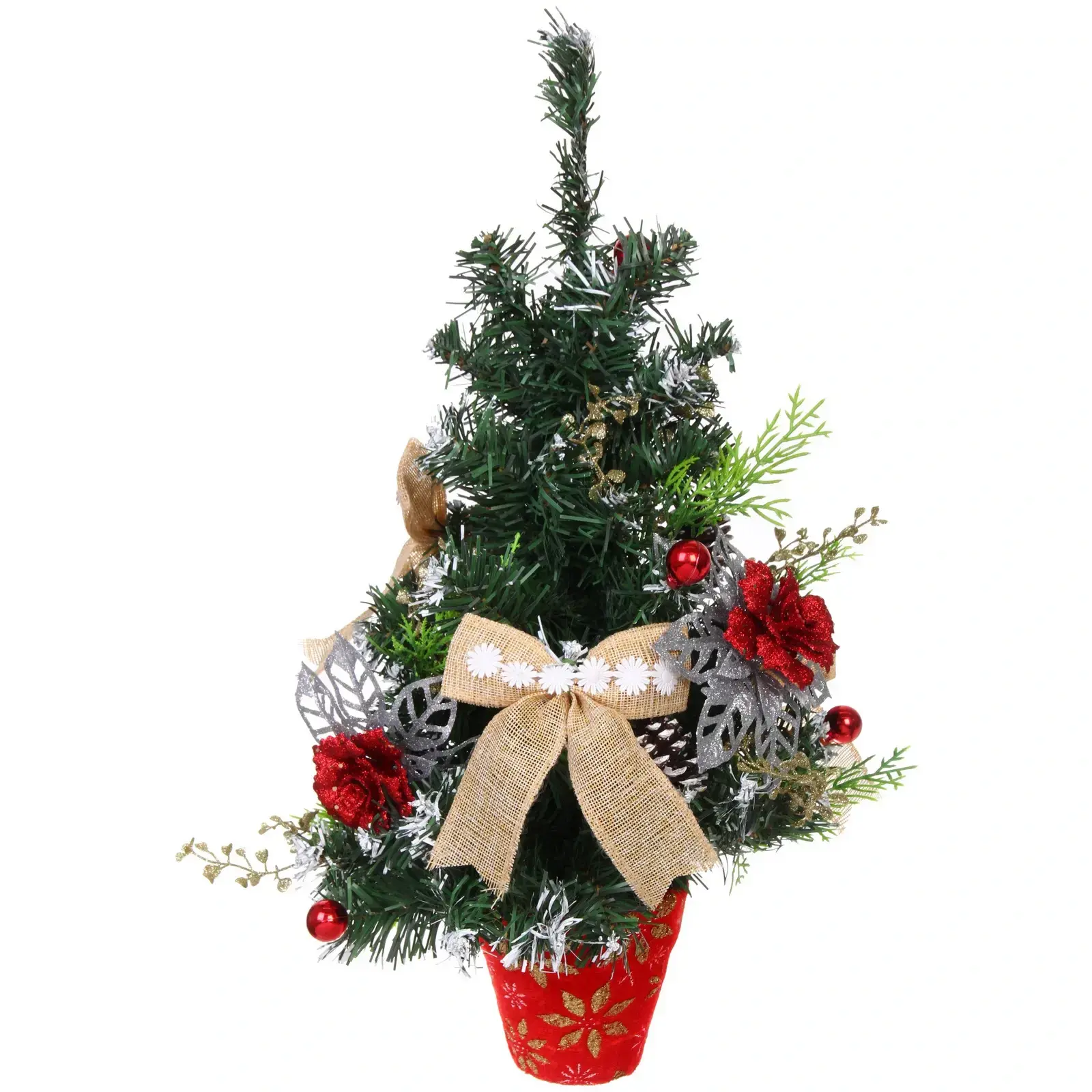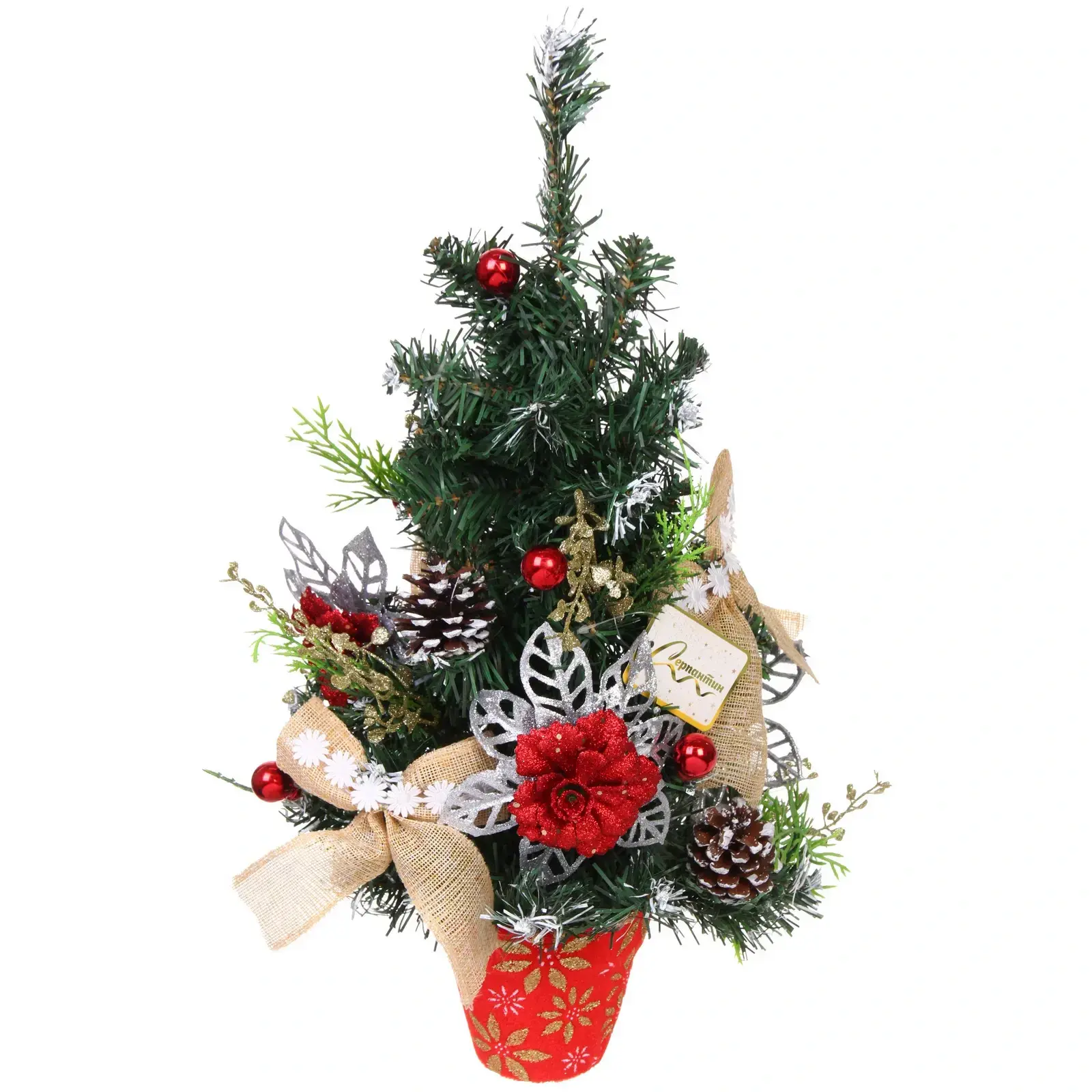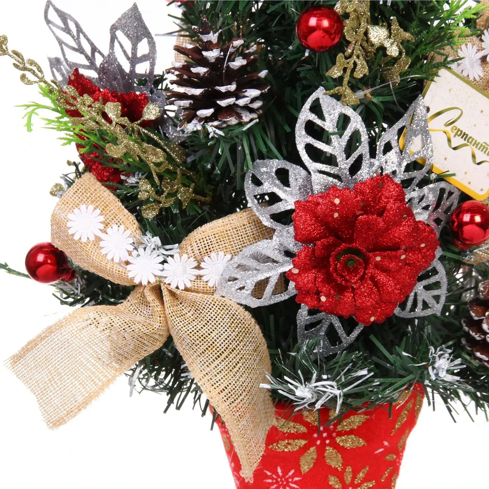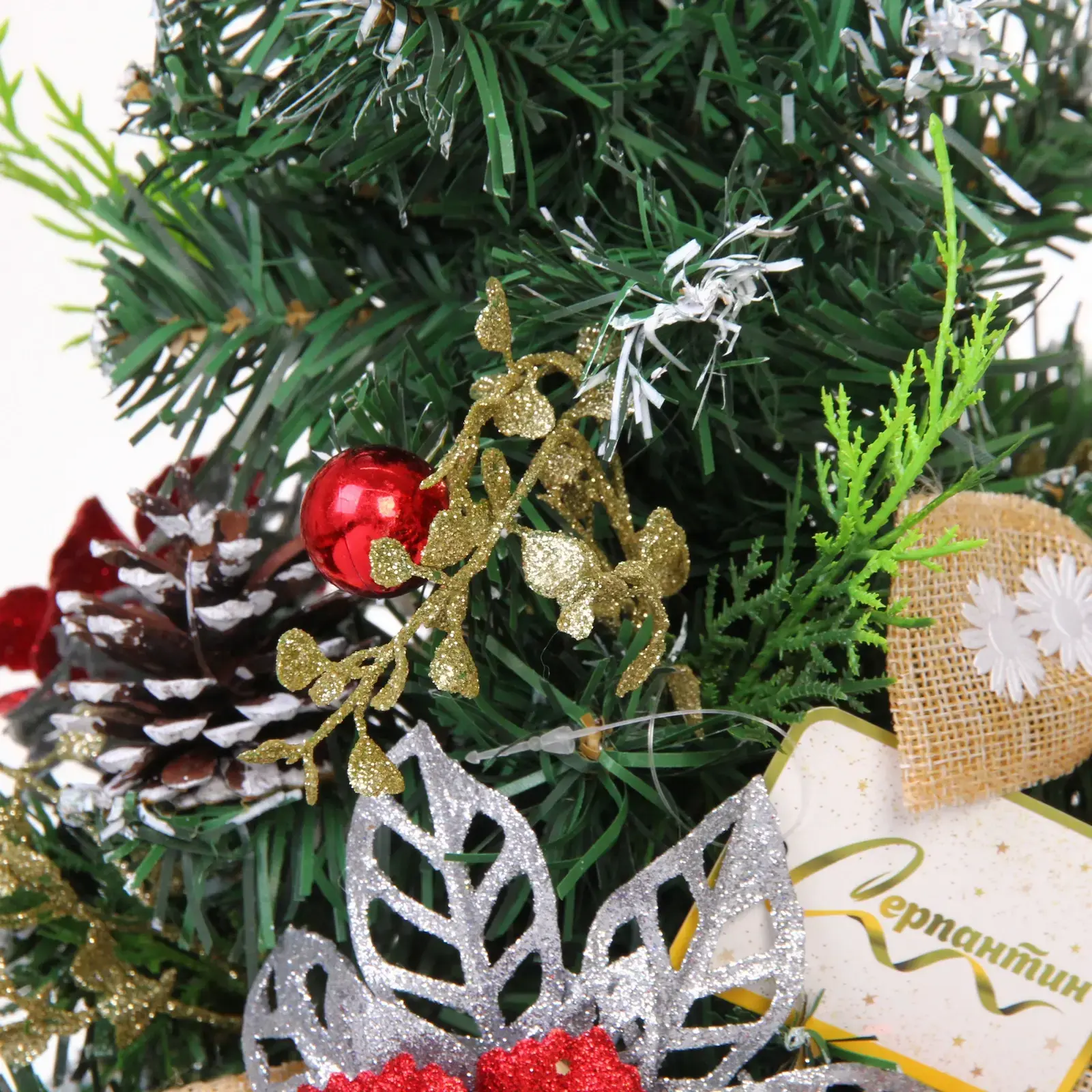 Елка выполнена из металла и ПВХ, что обеспечивает ей прочность и долговечность. Красный горшок с золотыми узорами добавляет дополнительный декоративный элемент, а бежевый бантик завершает образ. Высота елки составляет 50 см, что делает ее идеальной для размещения на столе или в качестве настольного украшения.
