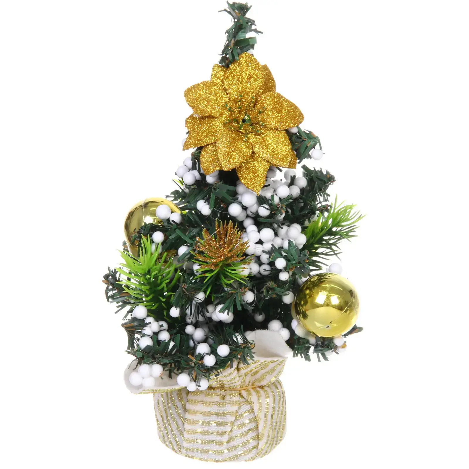 Елка изготовлена из металла и ПВХ, что обеспечивает ей надежность и долговечность. Золотистые и белые декоративные элементы придают ей праздничный вид, а текстильное основание с золотыми полосками создает эффект упаковки, что делает ее еще более привлекательной. Размер елки составляет 20 см, что делает ее идеальной для использования в ограниченных пространствах.