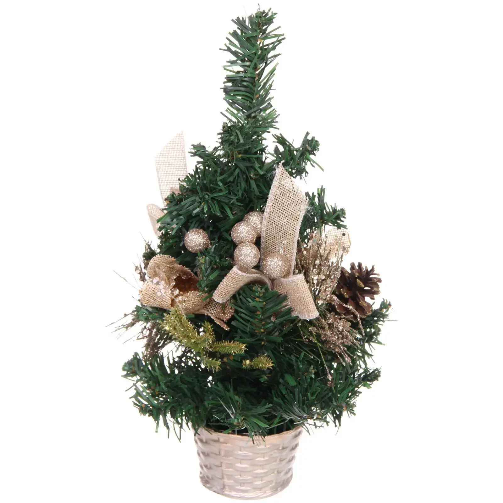 Елка имеет высоту 30 см и выполнена из искусственного материала, что делает ее легкой и удобной в использовании. В основании находится плетеная корзина светлого цвета, которая добавляет дополнительный шарм. Золотистые украшения и шишки на ветках подчеркивают праздничный стиль и делают эту елку идеальным выбором для создания новогоднего настроения.