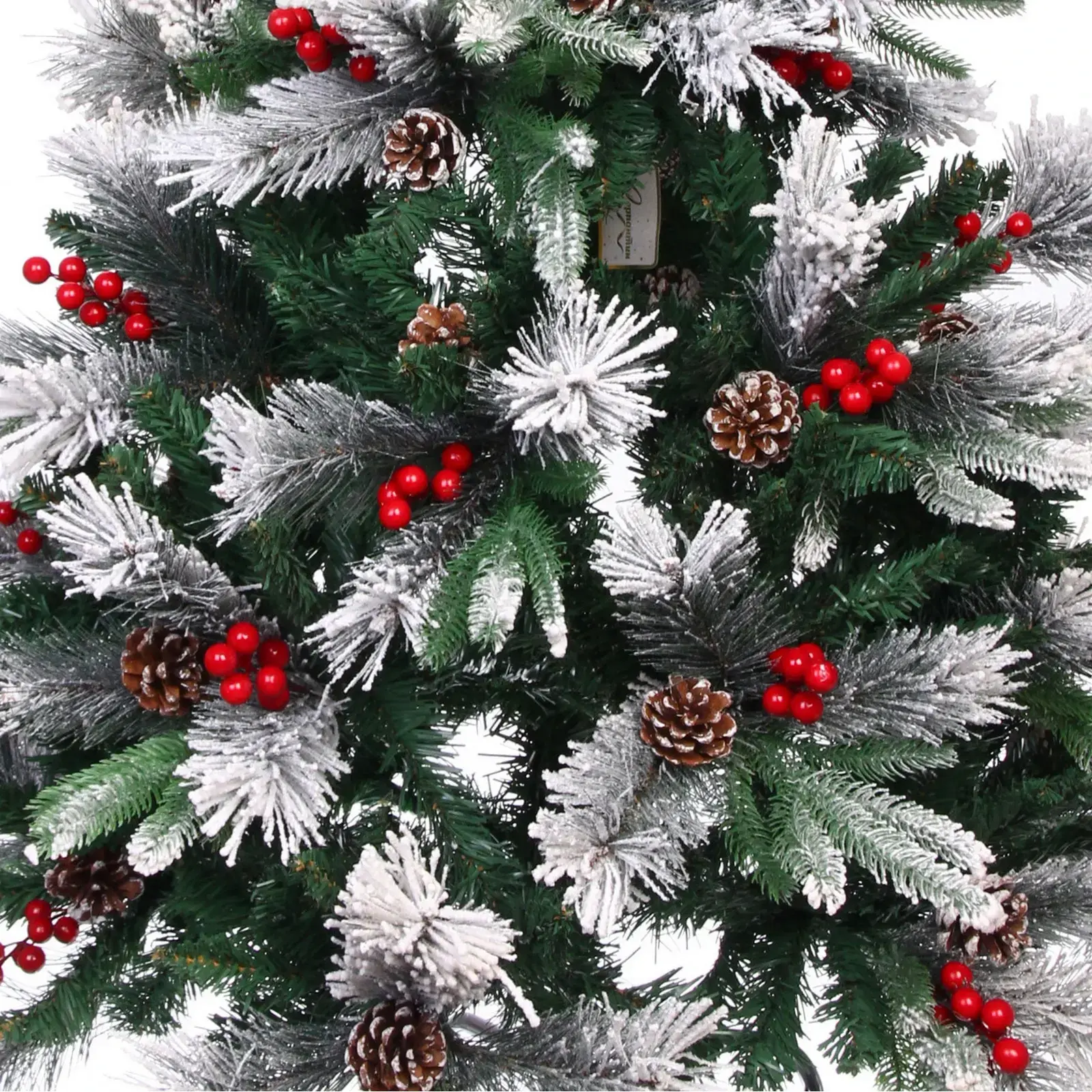Сочетание классического зеленого цвета с белым напылением и красными акцентами создает элегантный праздничный образ, который подходит для любого интерьера.