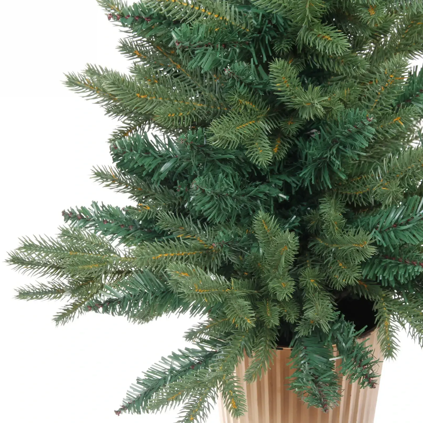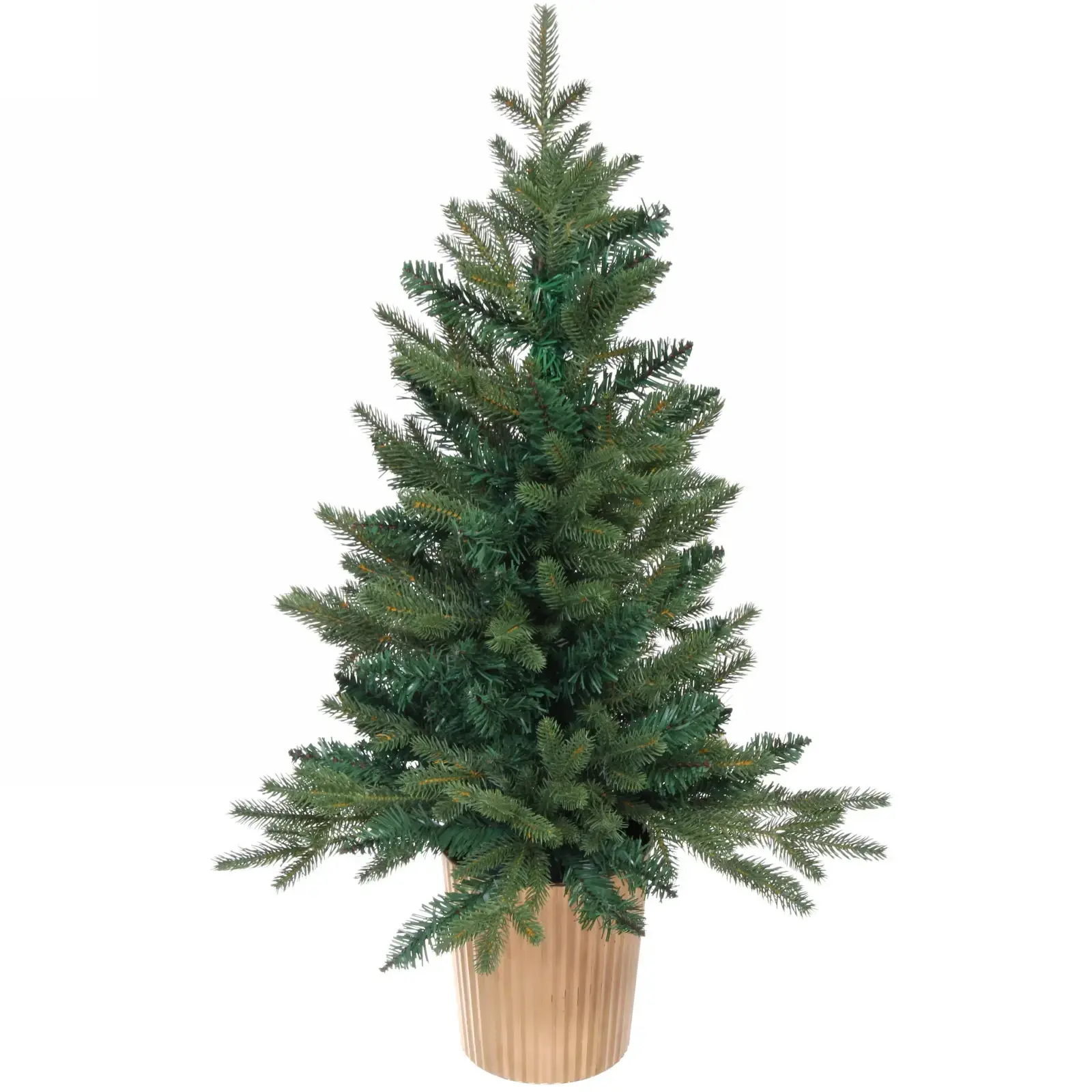 Елка имеет высоту 90 см и представлена в стильном горшке с рифлёной текстурой, выполненном в бежевом цвете. Это делает ее универсальным элементом декора, который легко впишется в любой интерьер. ПВХ и резина, использованные в производстве, гарантируют, что елка будет выглядеть свежо и привлекательно на протяжении всего праздничного сезона.