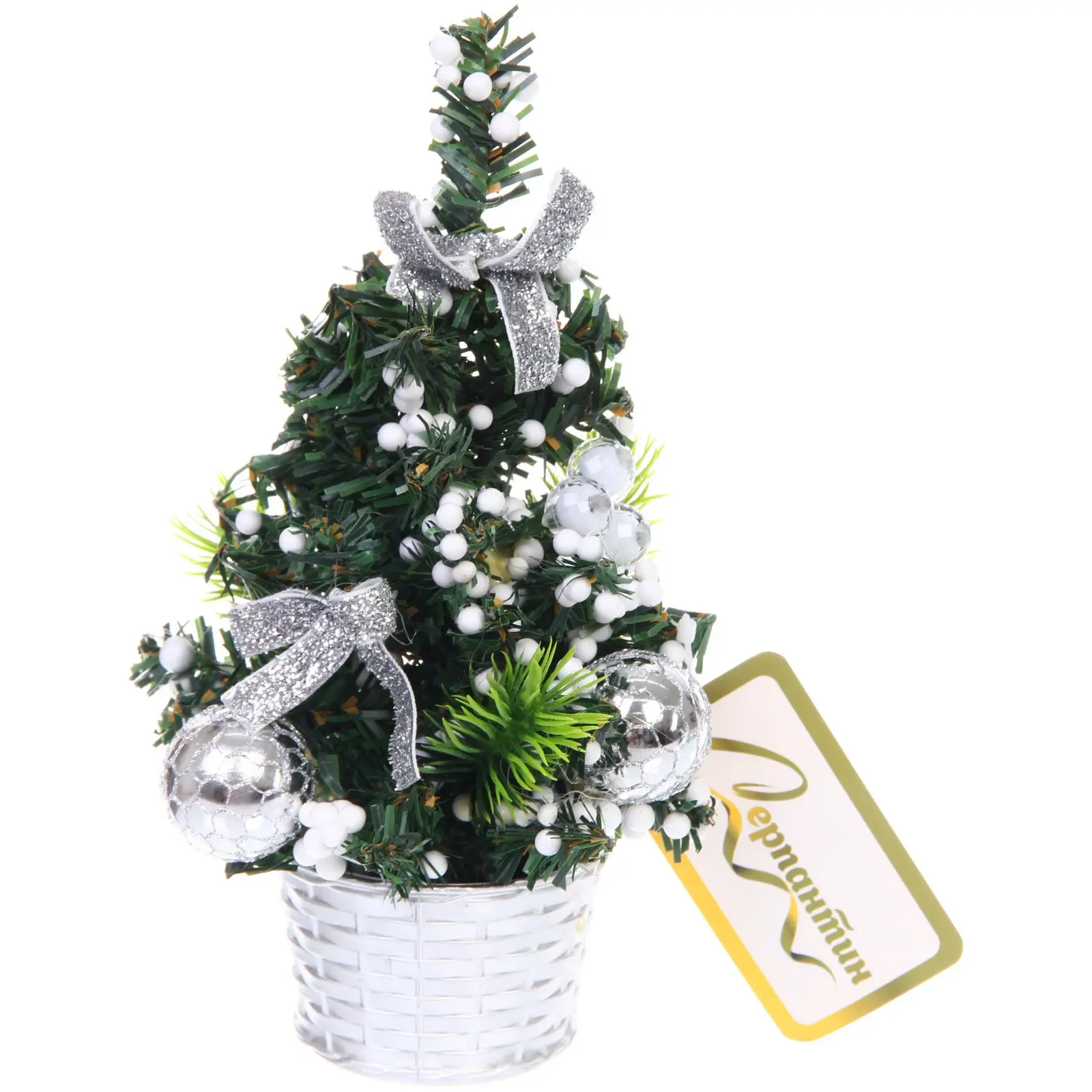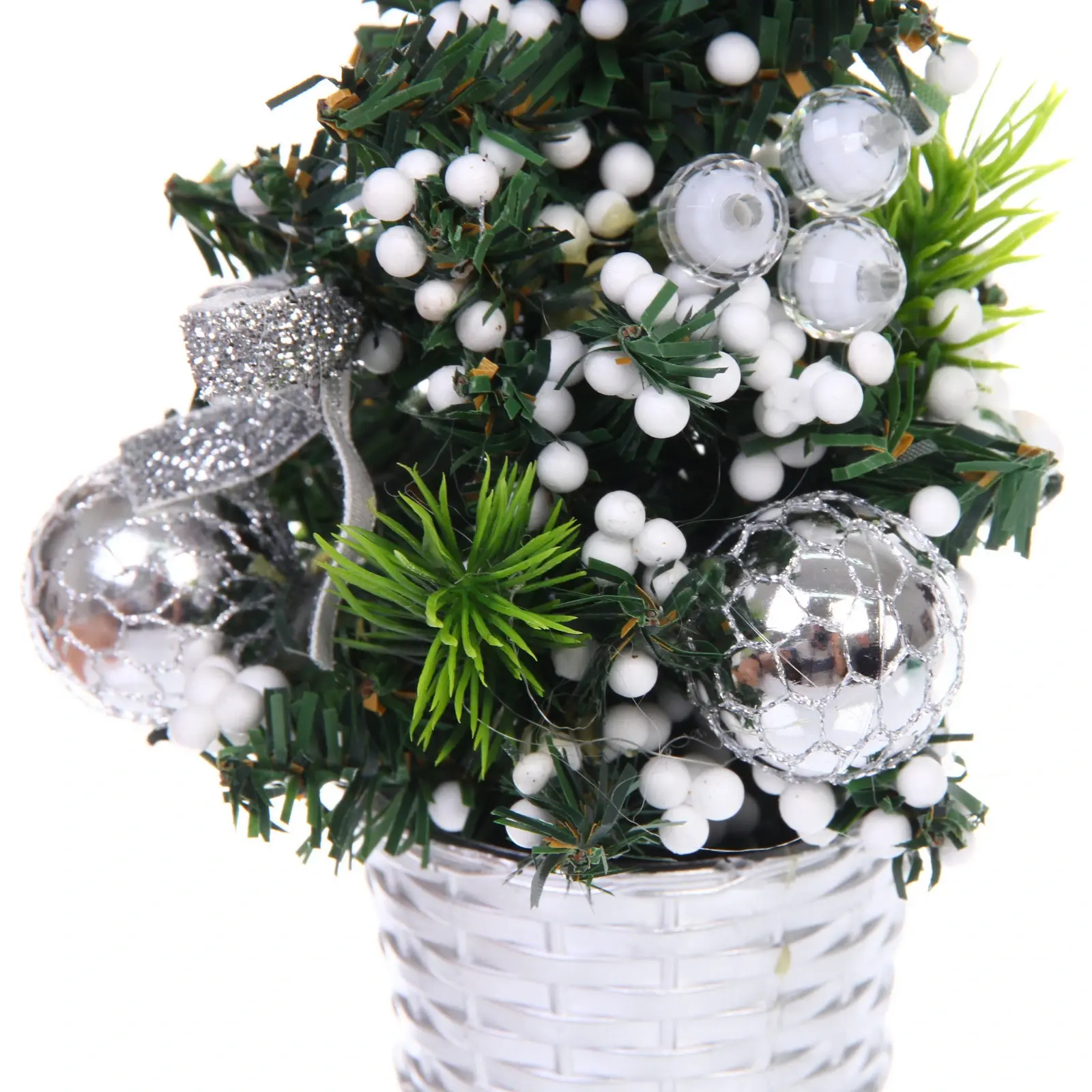 Сочетание серебристых шаров, атласных лент и белых ягод создает гармоничную композицию. ПВХ-хвоя с мелкими веточками повторяет структуру натуральной ели, а металлическое основание добавляет стильный акцент. Декоративные элементы надежно закреплены — вам не придется поправлять украшения.