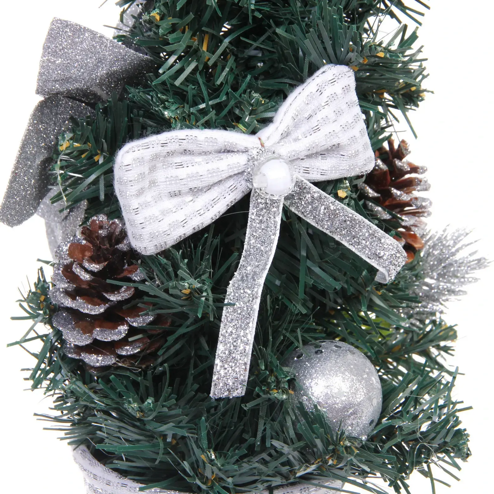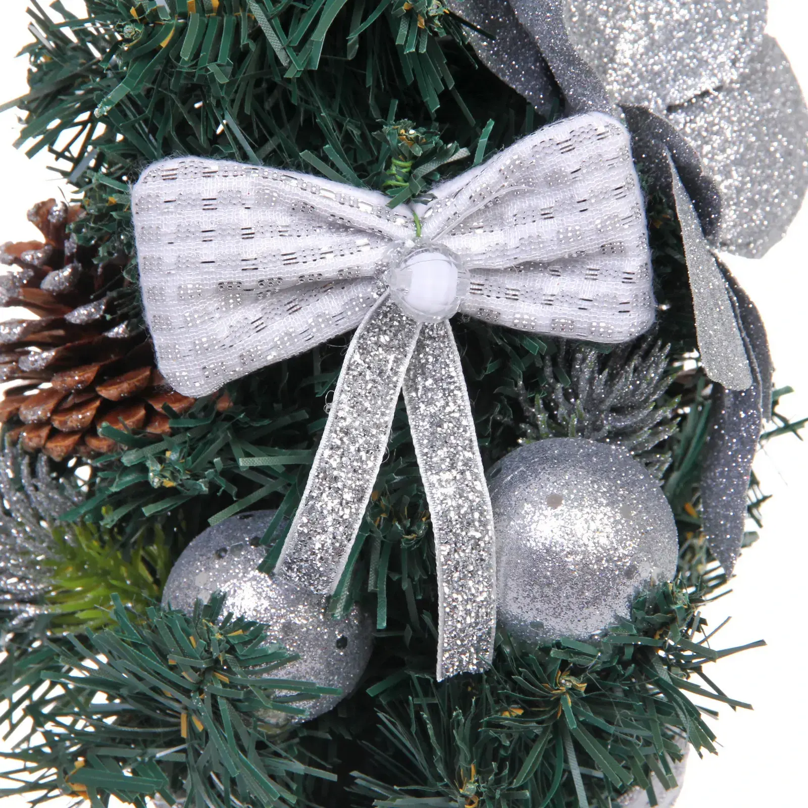 Элегантные серебристые украшения создают атмосферу волшебства и подчеркивают новогодний антураж. Бантики, шары и шишки тщательно подобраны для создания гармоничной композиции.