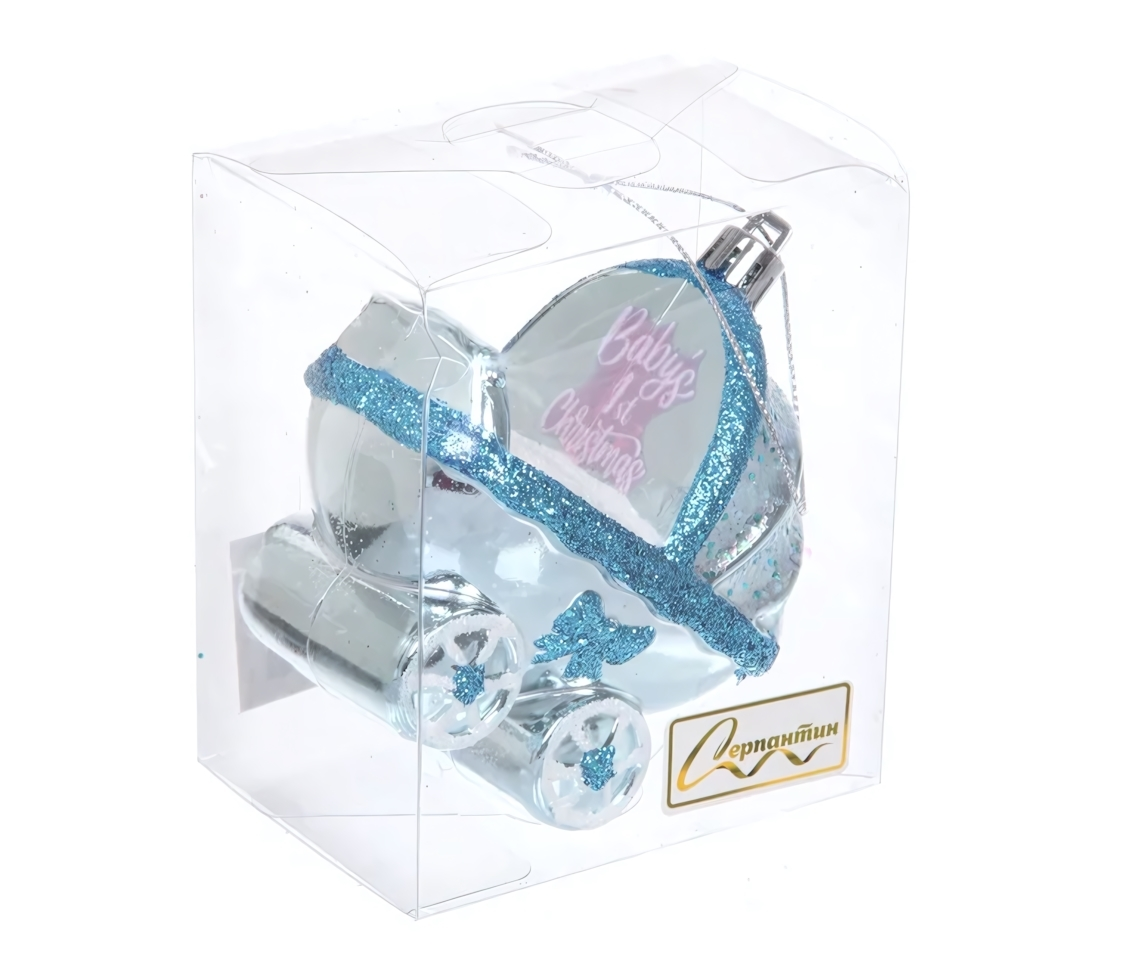Добавьте особое очарование вашей новогодней ёлке с этой стеклянной игрушкой в виде детской коляски. Голубой цвет в сочетании с блестками создаёт эффект свежести и тепла, а детальная проработка ручки, колес и надписи "Babies 1st Christmas" придаёт эмоциональную ценность, особенно для семей с маленькими детьми.