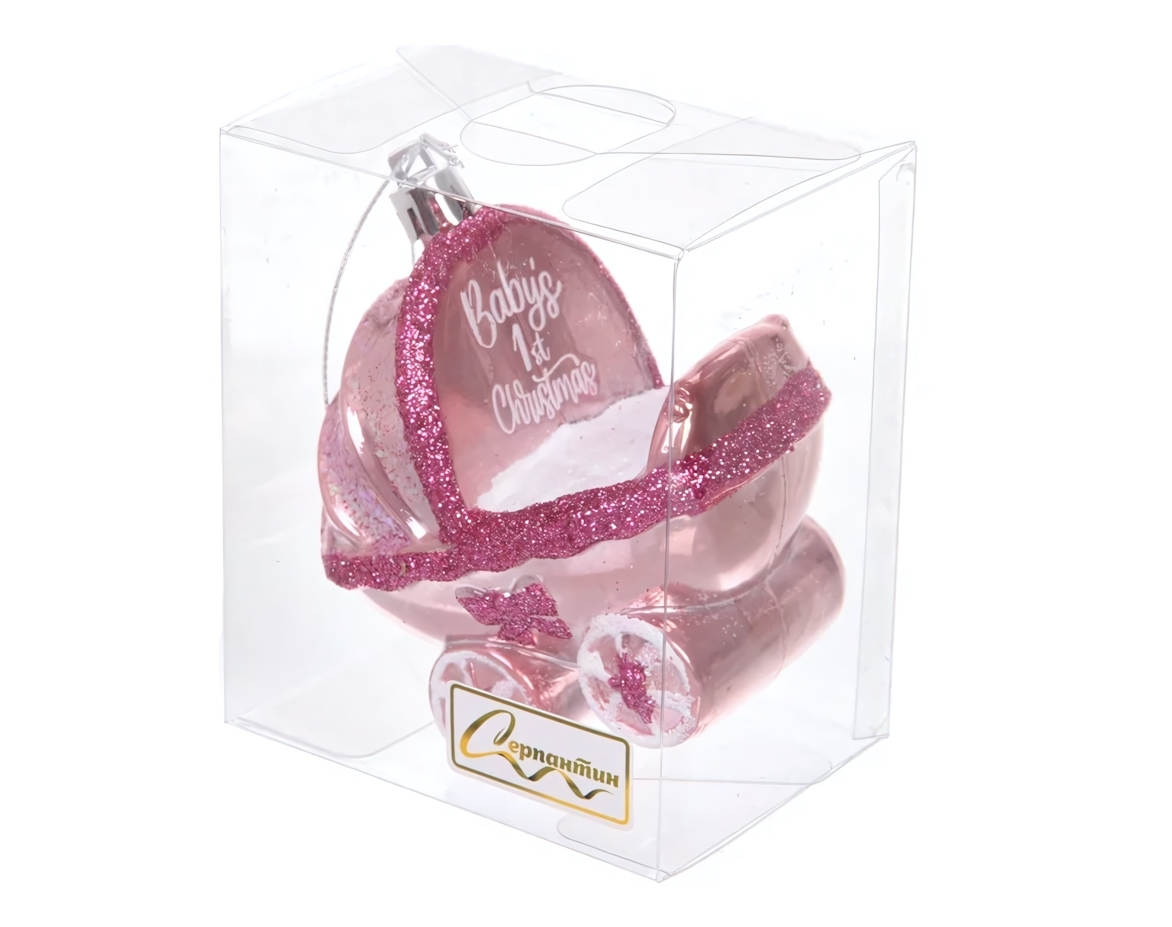 Эта елочная игрушка превращает любую новогоднюю композицию в уютную семейную сценку – яркий розовый шар, имитирующий детскую коляску, создаёт атмосферу первых радостных моментов малыша.