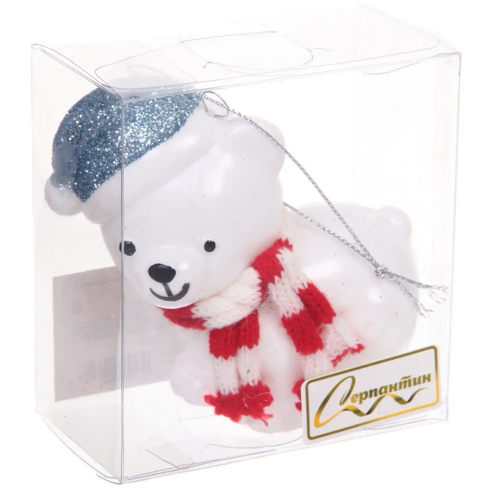 Игрушка поставляется в прозрачной подарочной коробке с удобной петлей для хранения. Вязаный шарф в красно-белую полоску создает особое ощущение домашнего уюта.