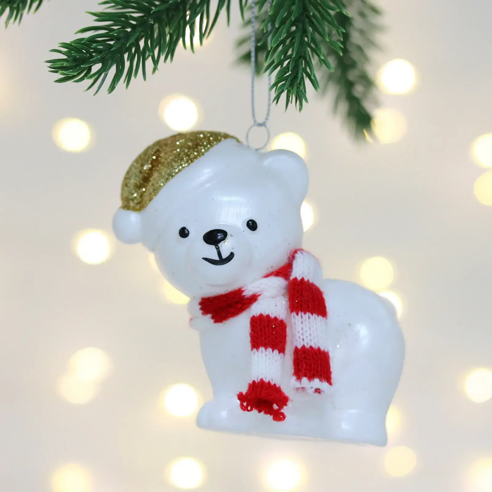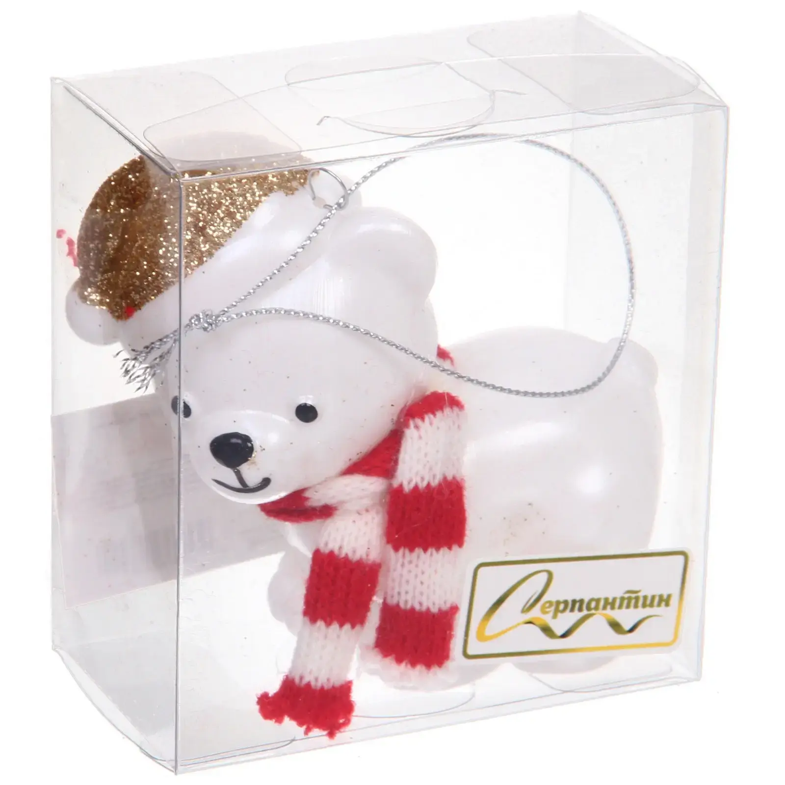 Игрушка в форме милого белого медвежонка, одетого в красную шапку с золотистыми блестками и красно-белый шарф, прекрасно подойдет для декорирования как домашней елки, так и офисного пространства. Благодаря кольцу для подвешивания, её легко разместить на ветках, создавая праздничное настроение. «Милый мишка» станет отличным подарком для детей и взрослых, добавляя радость в каждый дом.