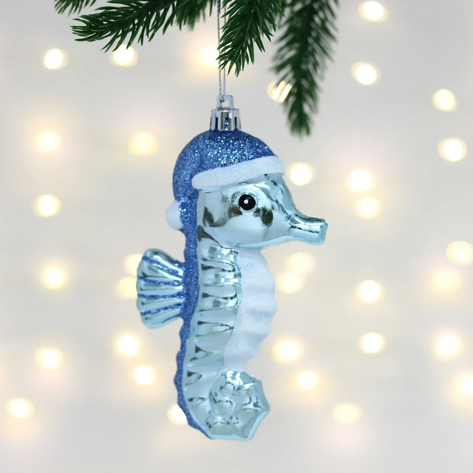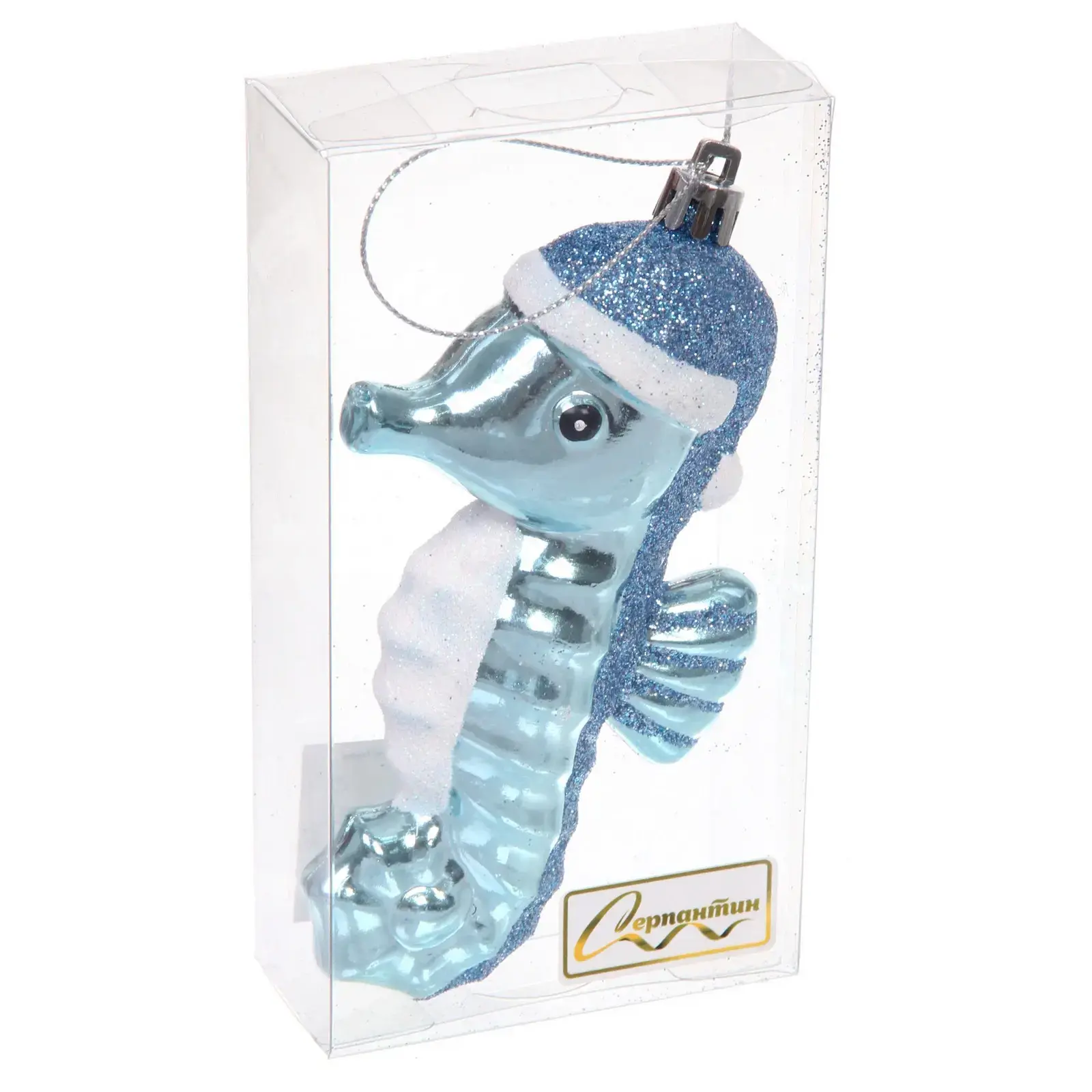 Создайте волшебную атмосферу праздника с изящной игрушкой в виде морского конька! Голубая блестящая поверхность и серебристые акценты превратят вашу елку в подводное царство, а декоративная шапочка добавит ноту зимнего настроения.
