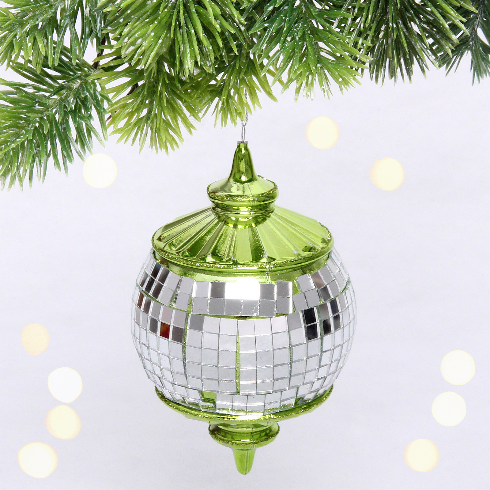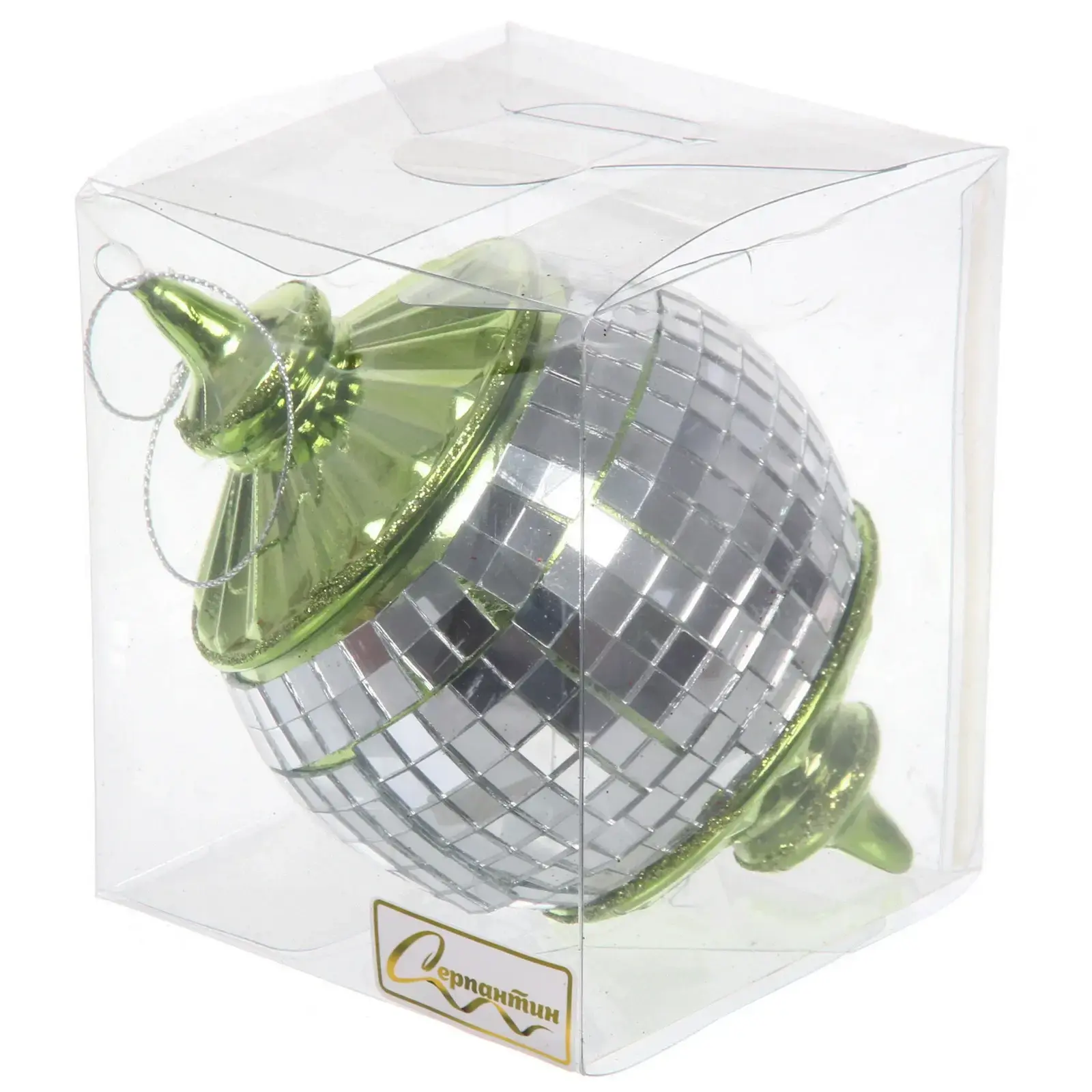 Игрушка имеет размеры 8х8х13 см и выполнена в ярком зеленом цвете с зеркальными квадратными вставками, создающими эффект диско-шара. Она идеально подходит для украшения новогодней ели, а также может использоваться для декорирования праздничных мероприятий и интерьеров. Легкая и удобная в использовании, игрушка оснащена петелькой для подвешивания, что делает процесс декорирования простым и быстрым.