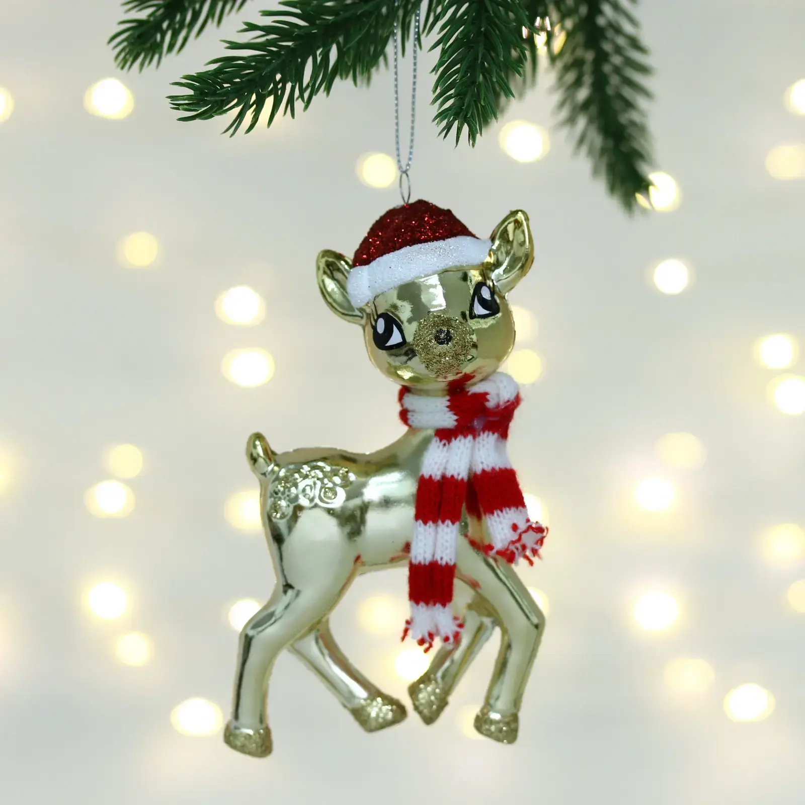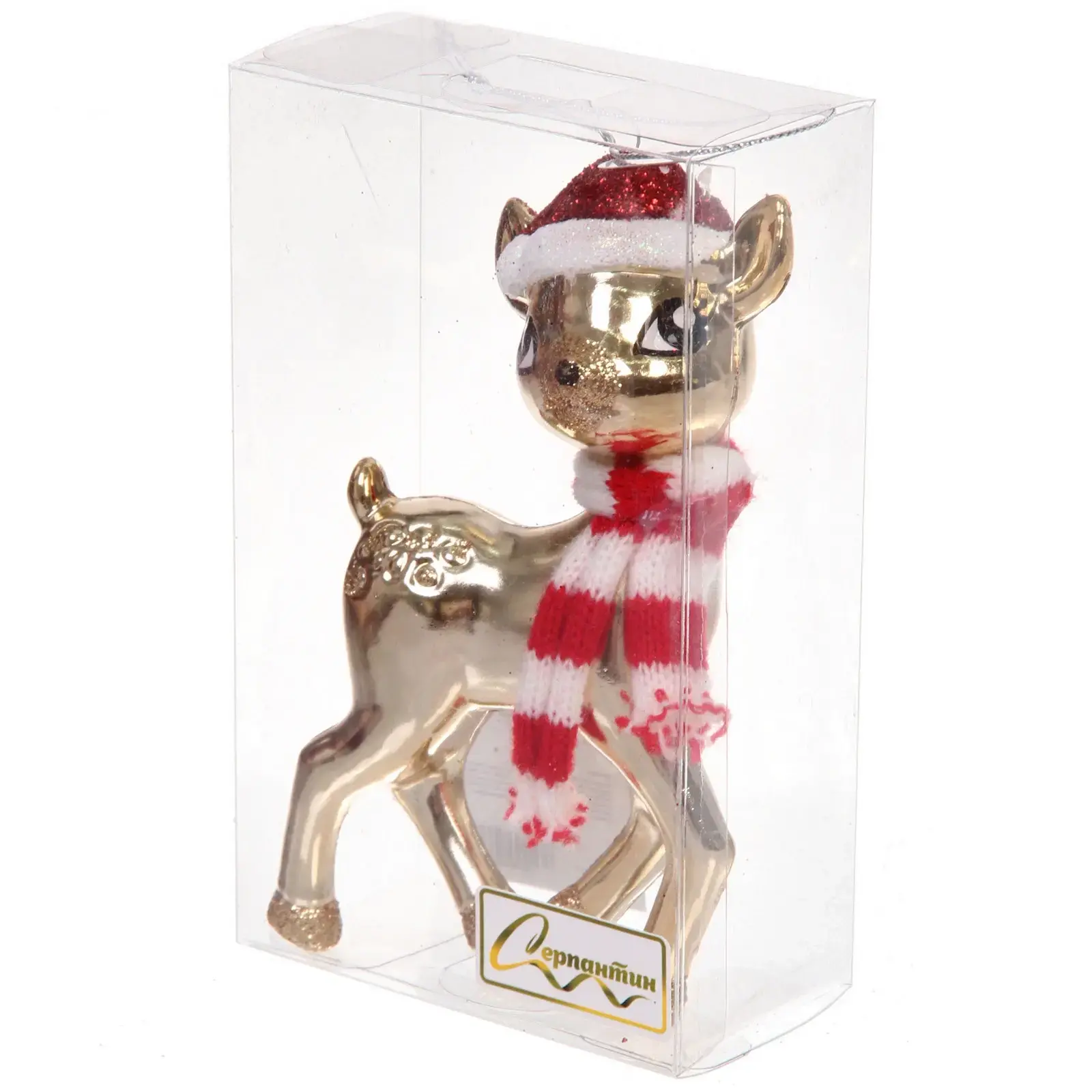 Фигурка оленёнка порадует тщательной проработкой: ажурные рога, рельефные узоры на туловище и выразительные глаза. Красная шапочка с белой опушкой и полосатый шарф добавят ярких акцентов в золотистую палитру украшения.