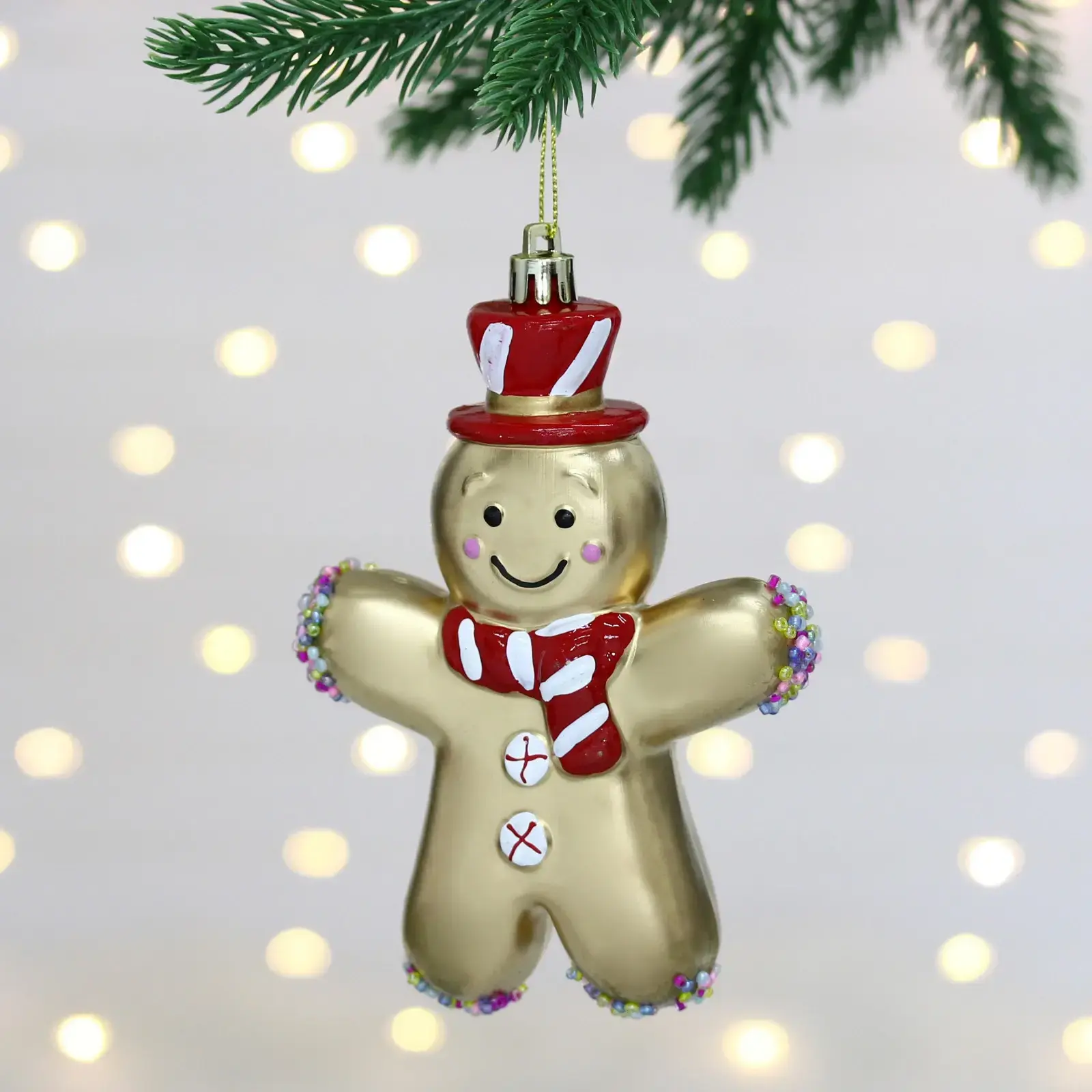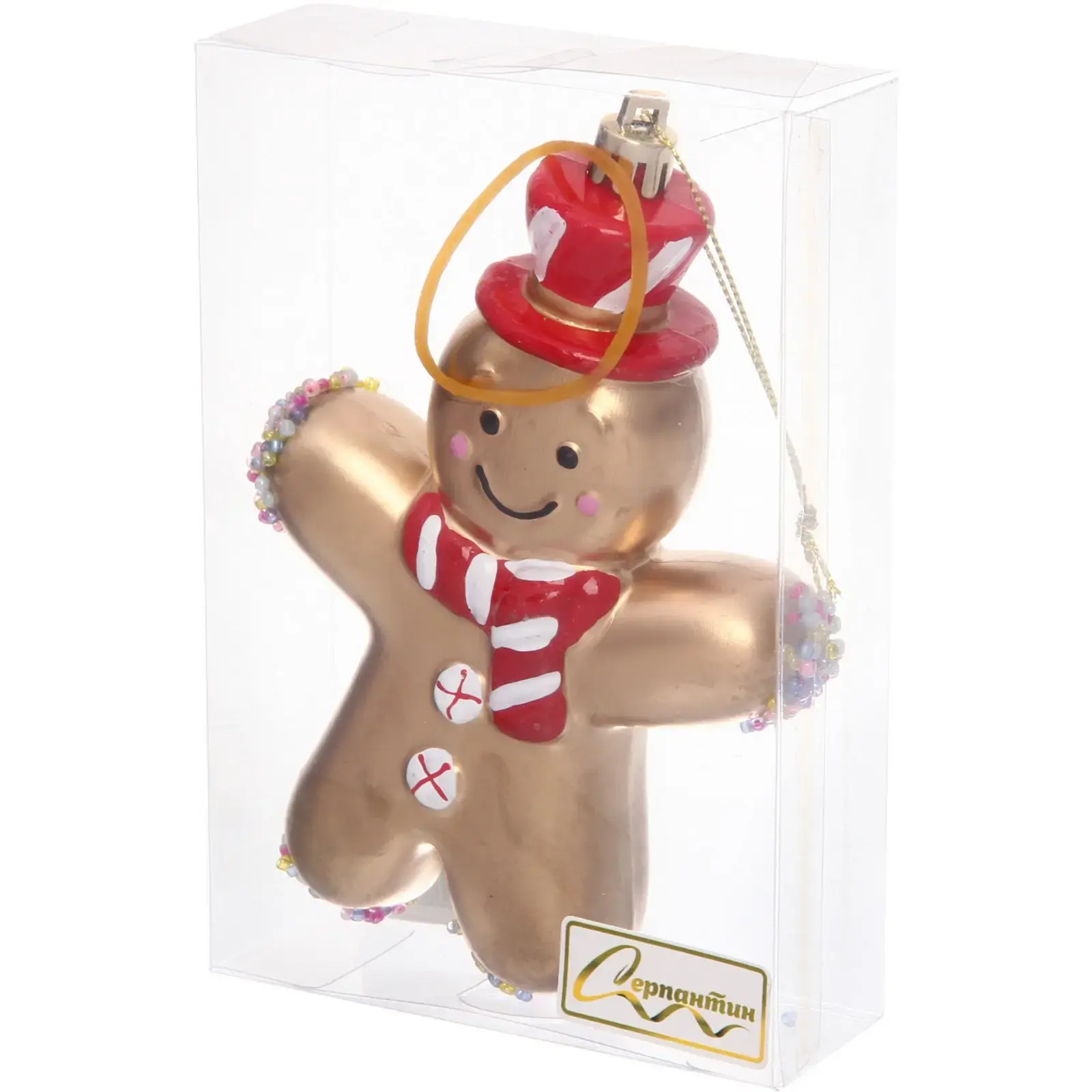 Игрушка поставляется в удобной прозрачной упаковке, защищающей от повреждений при хранении. Красный цилиндр, белый шарф и бусины создают классический образ новогоднего пряничного человечка.