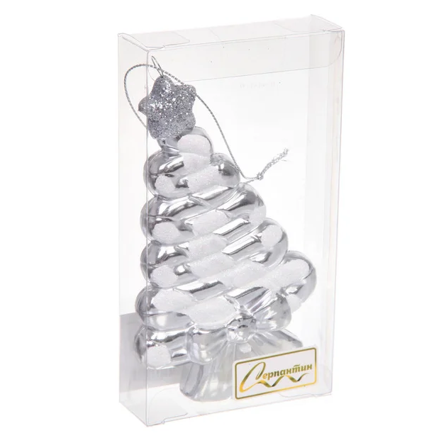 Высота игрушки — 14 см. Форма ёлки выполнена с изящной спиралью и тонкими выступами, а верхушку венчает звезда с блестками, придающая дополнительный акцент. Поставляется в прозрачной упаковке, которая защищает поверхность от пыли и повреждений. Цвет — серебро.