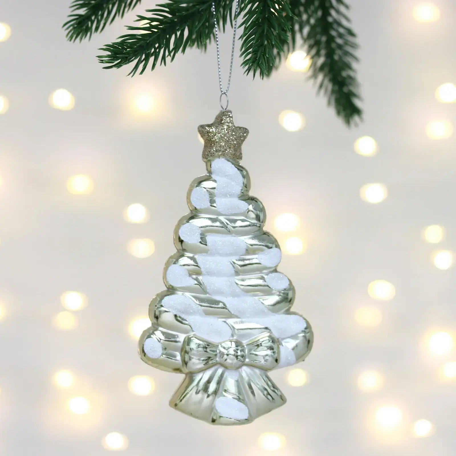 Превратите вашу елку в настоящий символ праздника с изысканной елочной игрушкой 'Сладкая ёлочка'. Благородный оттенок шампань и элегантные белые узоры создают атмосферу зимней сказки.