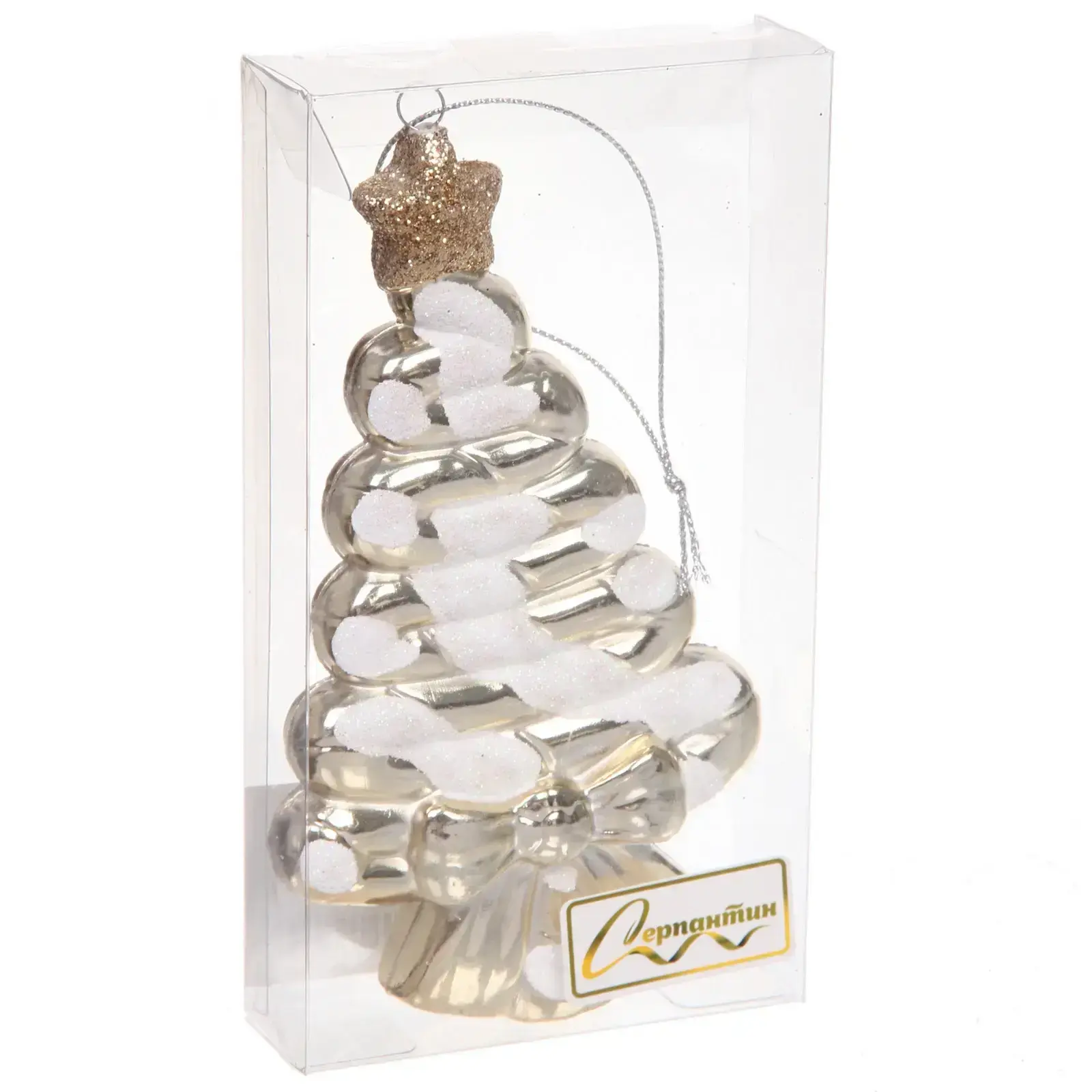 Игрушка поставляется в прозрачной подарочной упаковке, что делает ее отличным вариантом для презента. Золотистая звезда на вершине и декоративный элемент внизу добавляют роскоши вашему праздничному декору.
