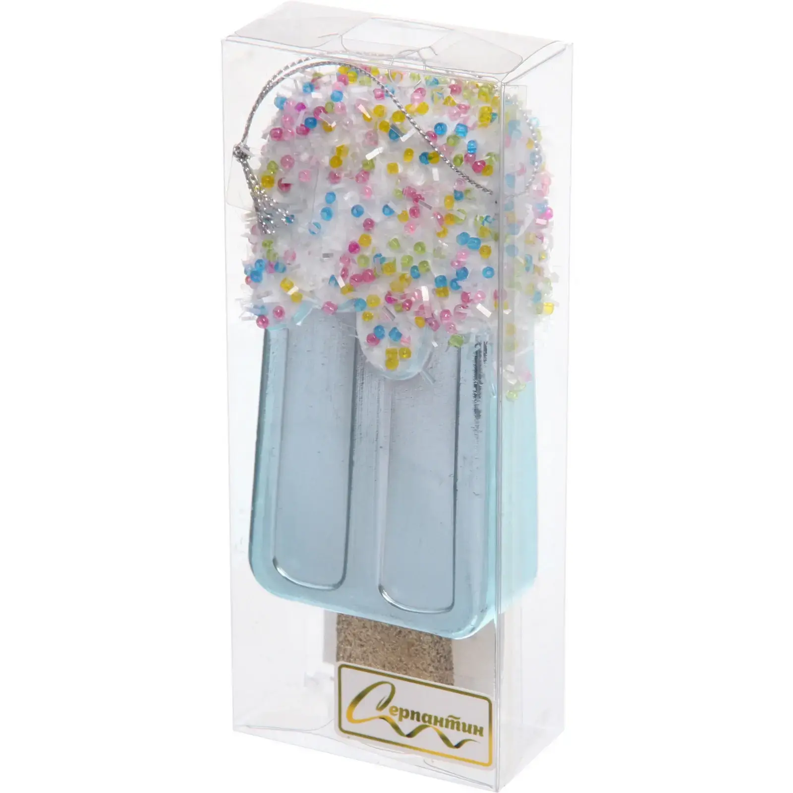 Пластиковая игрушка в форме мороженого с изысканным декором станет ярким акцентом вашего праздничного интерьера. Нежные голубые оттенки в сочетании с разноцветными бусинами создают атмосферу зимнего волшебства.