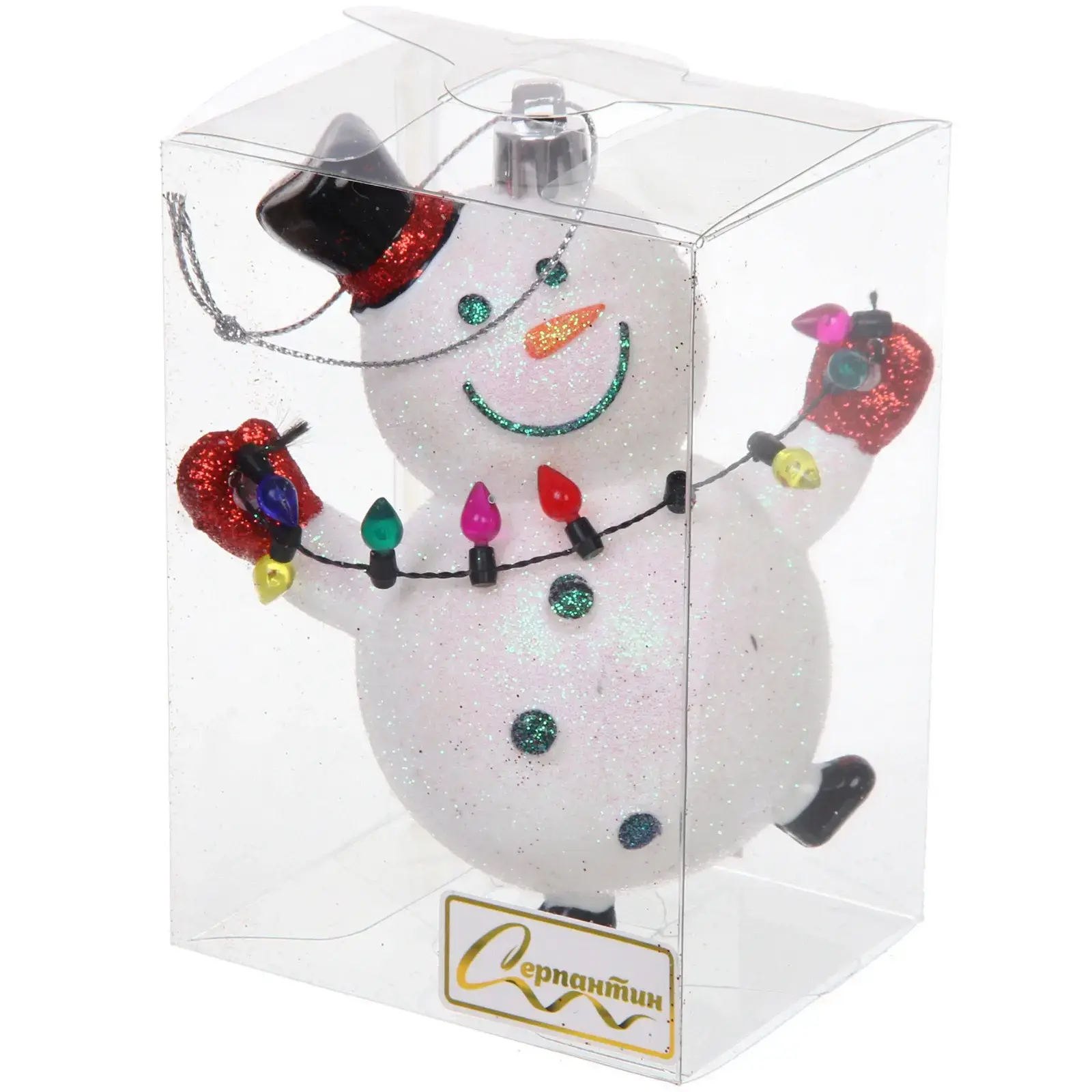 Размеры игрушки составляют 17,4 см в высоту, 10 см в ширину и 6 см в глубину. Она легкая и компактная, что делает ее удобной для хранения и транспортировки. Благодаря блестящей поверхности, снеговик будет красиво смотреться на фоне новогодней елки, отражая свет и создавая праздничное настроение.