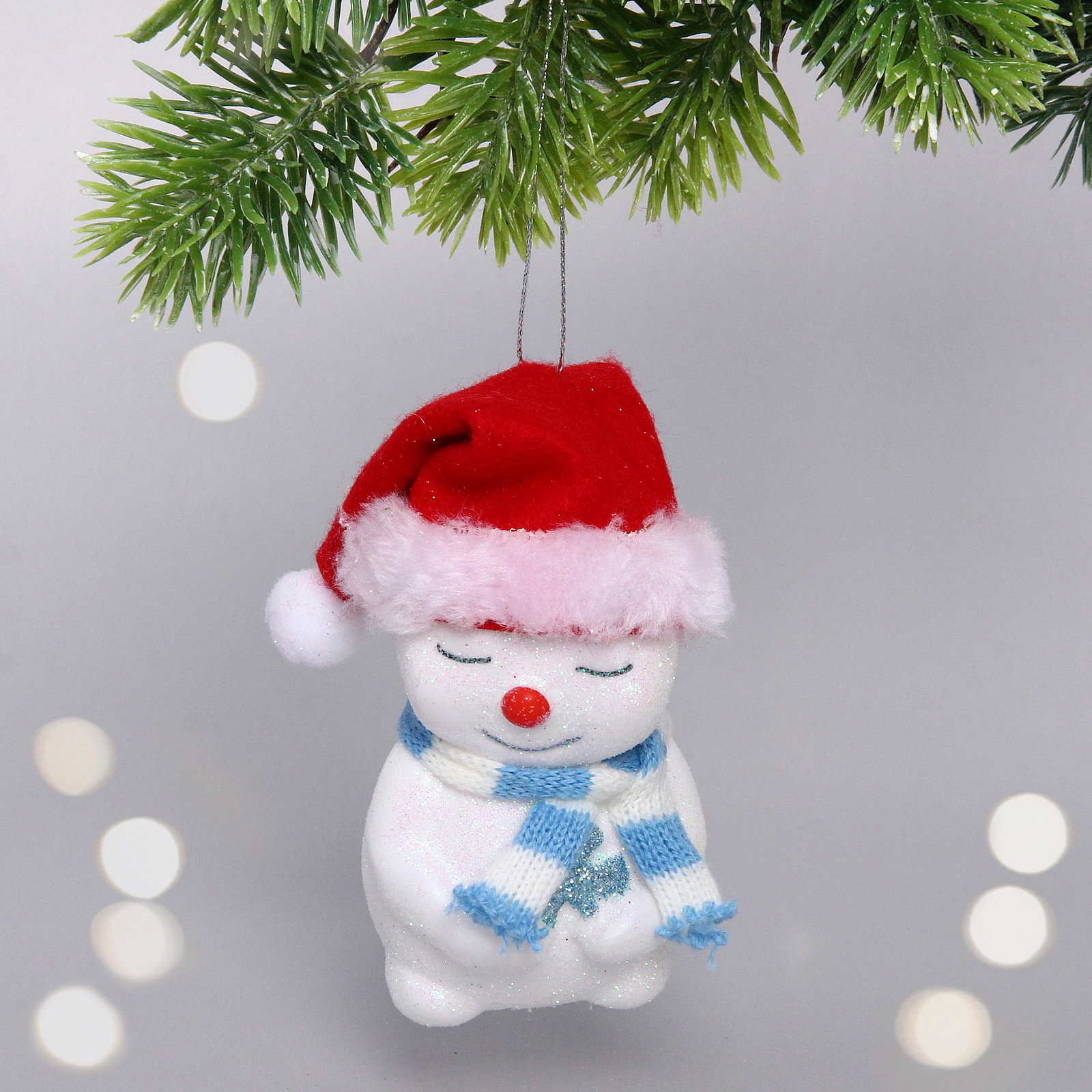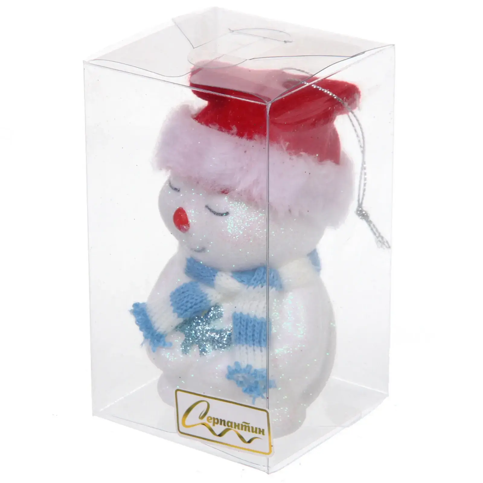 Снеговик выполнен в белом цвете с красной шапкой и сине-белым шарфом, что делает его стильным элементом новогоднего декора. Блестящая отделка добавляет игрушке особый шарм, а компактные размеры позволяют легко хранить ее после праздников. Не упустите возможность сделать ваш Новый год незабываемым с этой очаровательной елочной игрушкой!