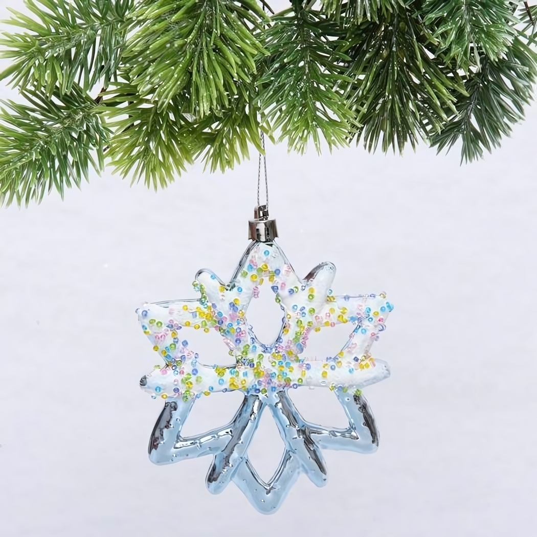 Игрушка изготовлена из прочного материала с глянцевым покрытием, устойчивого к механическим повреждениям. Цветные бусины по краям снежинки создают эффект мерцания при попадании света.