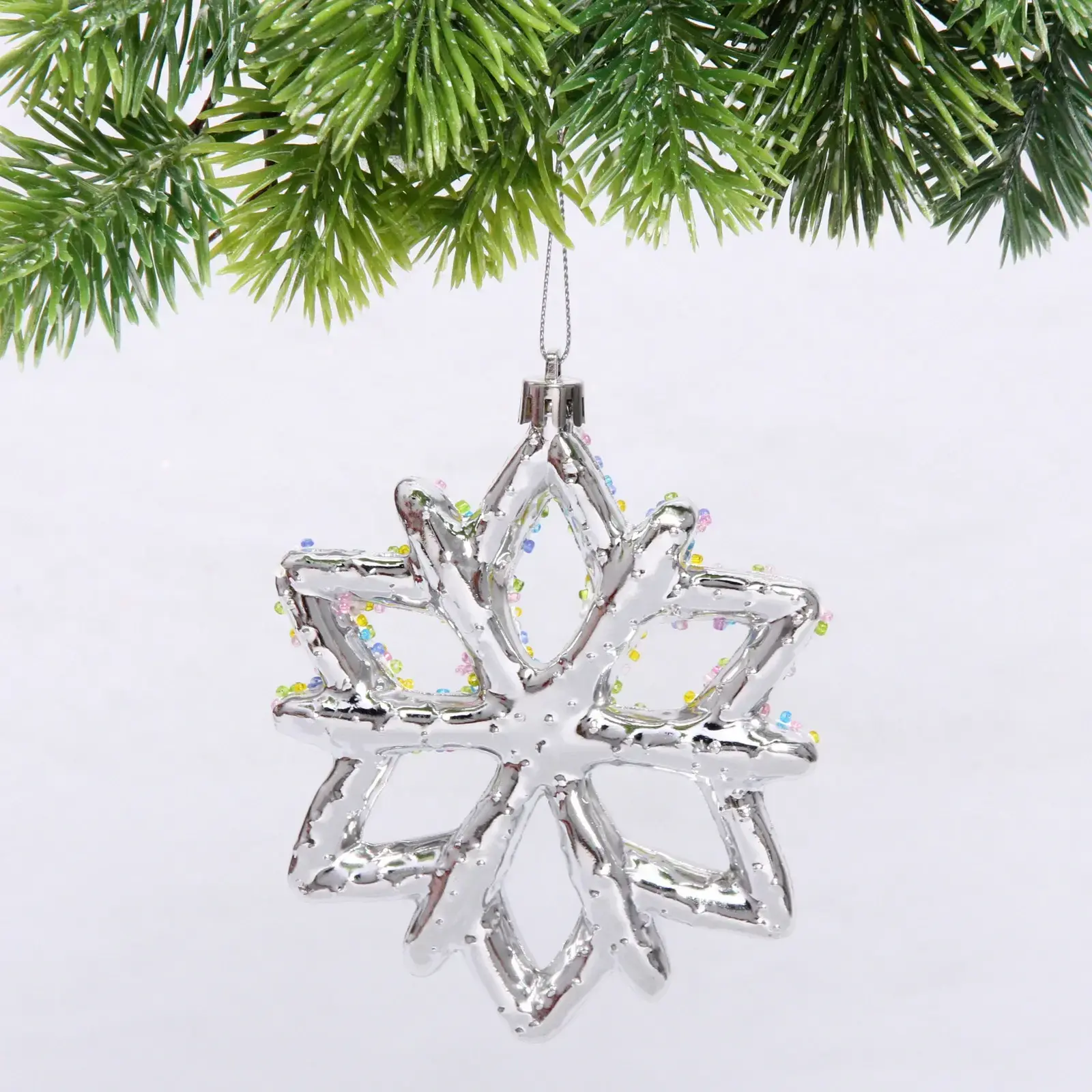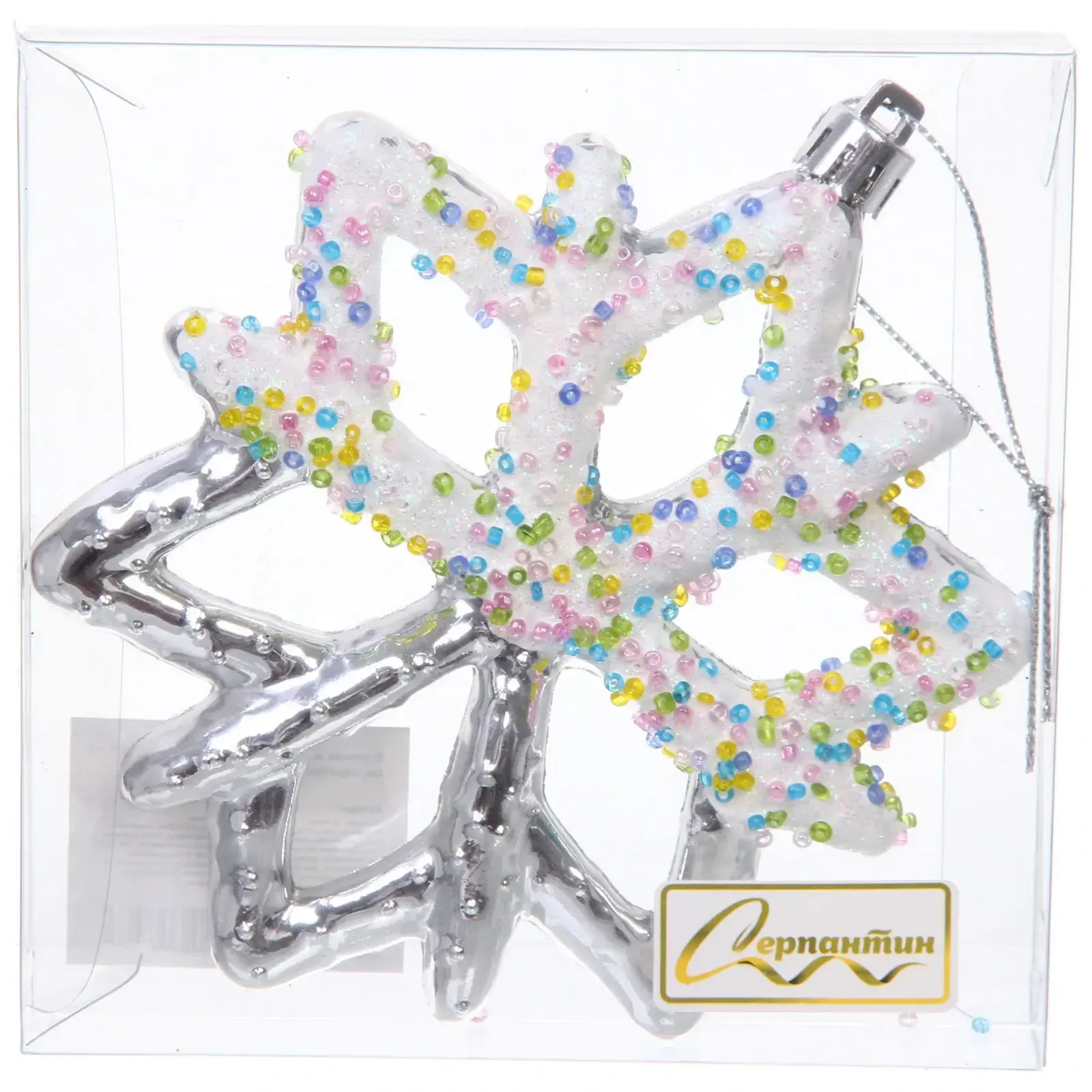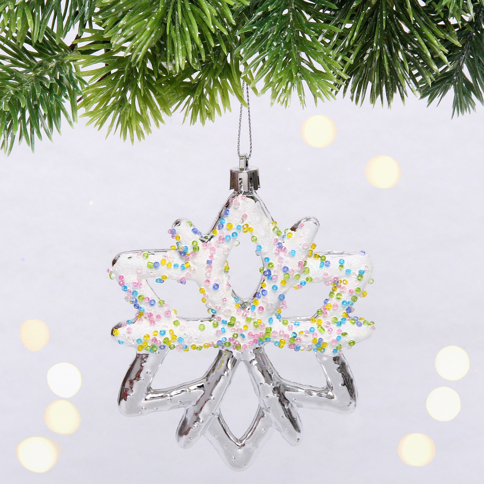 Игрушка выполнена из пластика, что делает ее безопасной для детей и домашних животных. Бусины, украшающие снежинку, имеют разнообразные цвета: желтый, розовый, голубой и зеленый, что добавляет игривости и радости в ваш новогодний декор. Не упустите возможность сделать ваш праздник незабываемым с этой красивой елочной игрушкой!