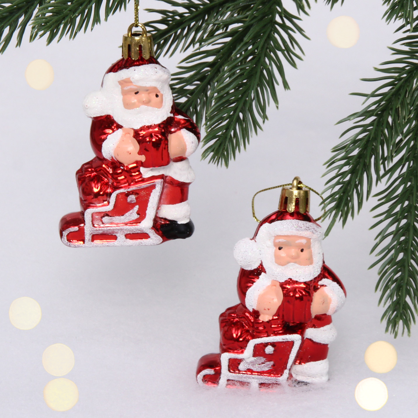 Каждая фигурка изображает Деда Мороза в традиционном красном костюме с белой отделкой, стоящего на резных санях. Благодаря сквозному креплению, игрушки можно поворачивать разными сторонами к зрителям. Упаковка с прозрачным окном позволяет увидеть товар без вскрытия — идеально для подарка.