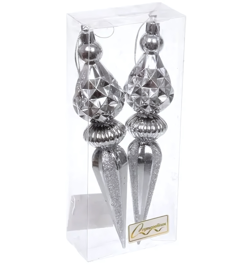 Игрушки имеют размеры 5х5х19 см и представлены в наборе из 2 штук, что позволяет вам легко комбинировать их с другими украшениями. Они идеально подходят для декорирования как домашних, так и офисных елок. Благодаря своей универсальной форме и цвету, игрушки легко вписываются в любой стиль оформления.