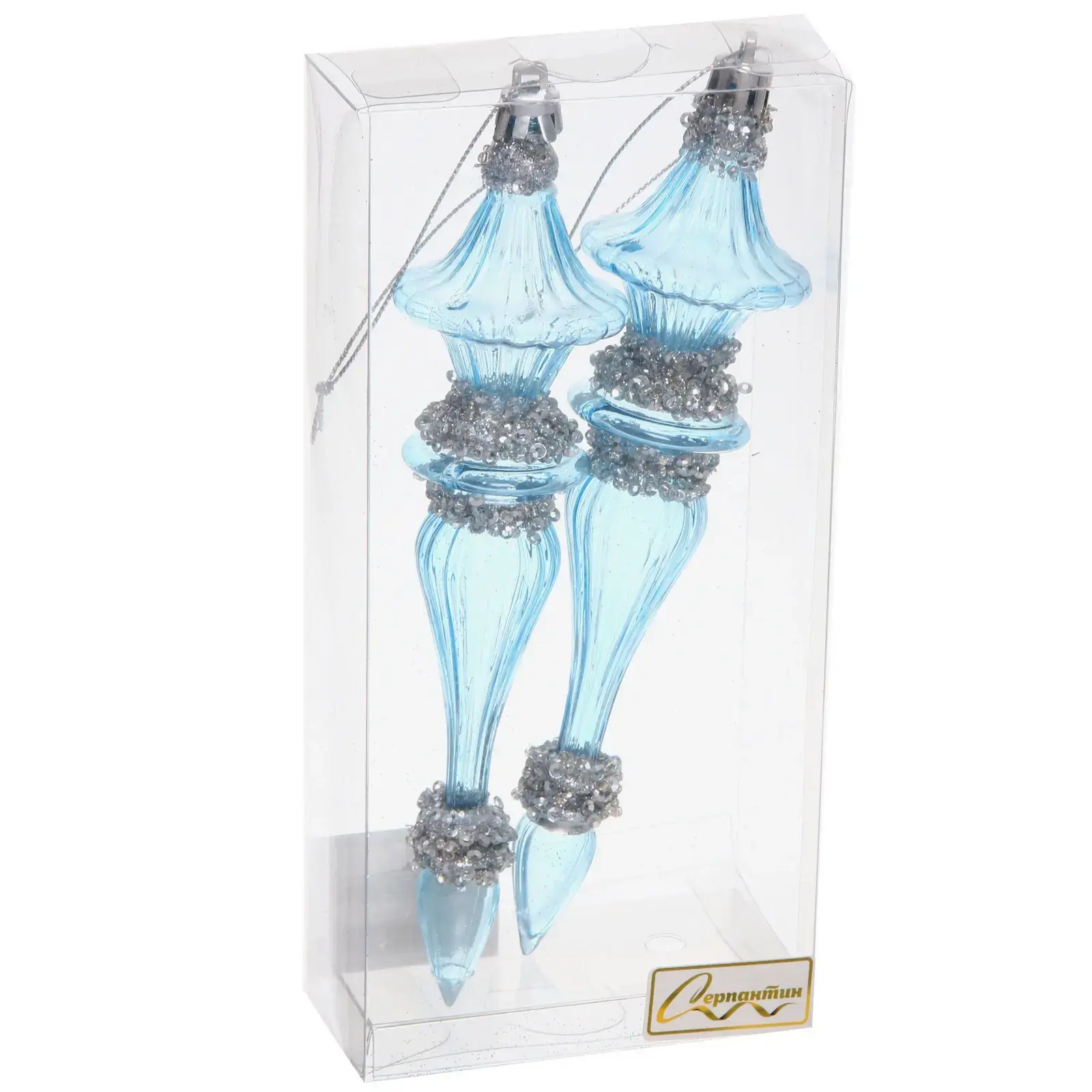 Материал: пластик. Цвет: светло‑голубой. Размеры: 4,5 × 4,5 × 19 см. Количество в наборе: 2 шт. Отделка: серебристая бисерная нить и блёстки, украшающие среднюю и нижнюю часть каждой игрушки.