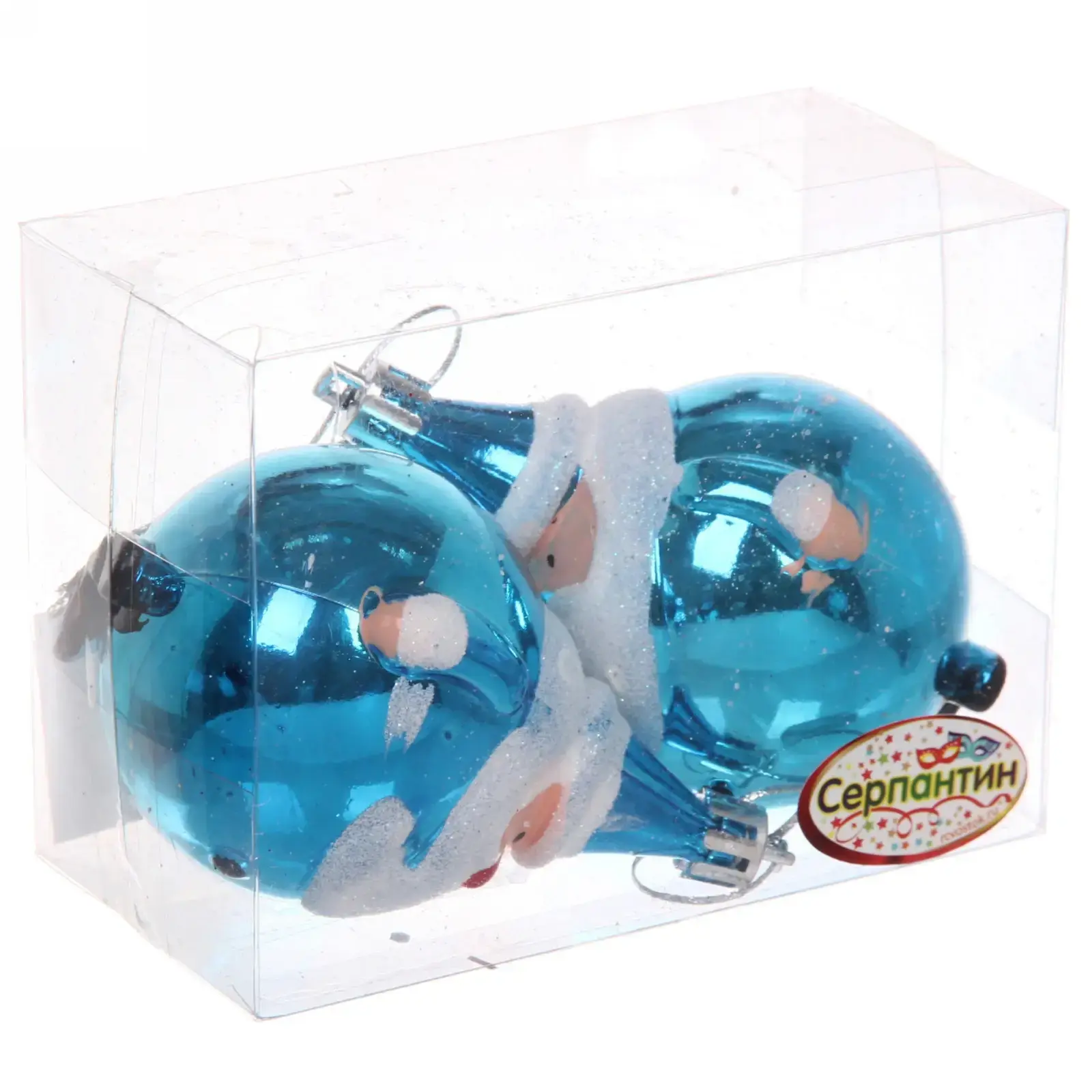 Диаметр каждой игрушки составляет 6 см. В набор входит две игрушки синего цвета с белыми и красными элементами декора. Игрушки поставляются в прозрачной упаковке с брендом "Серпантин".