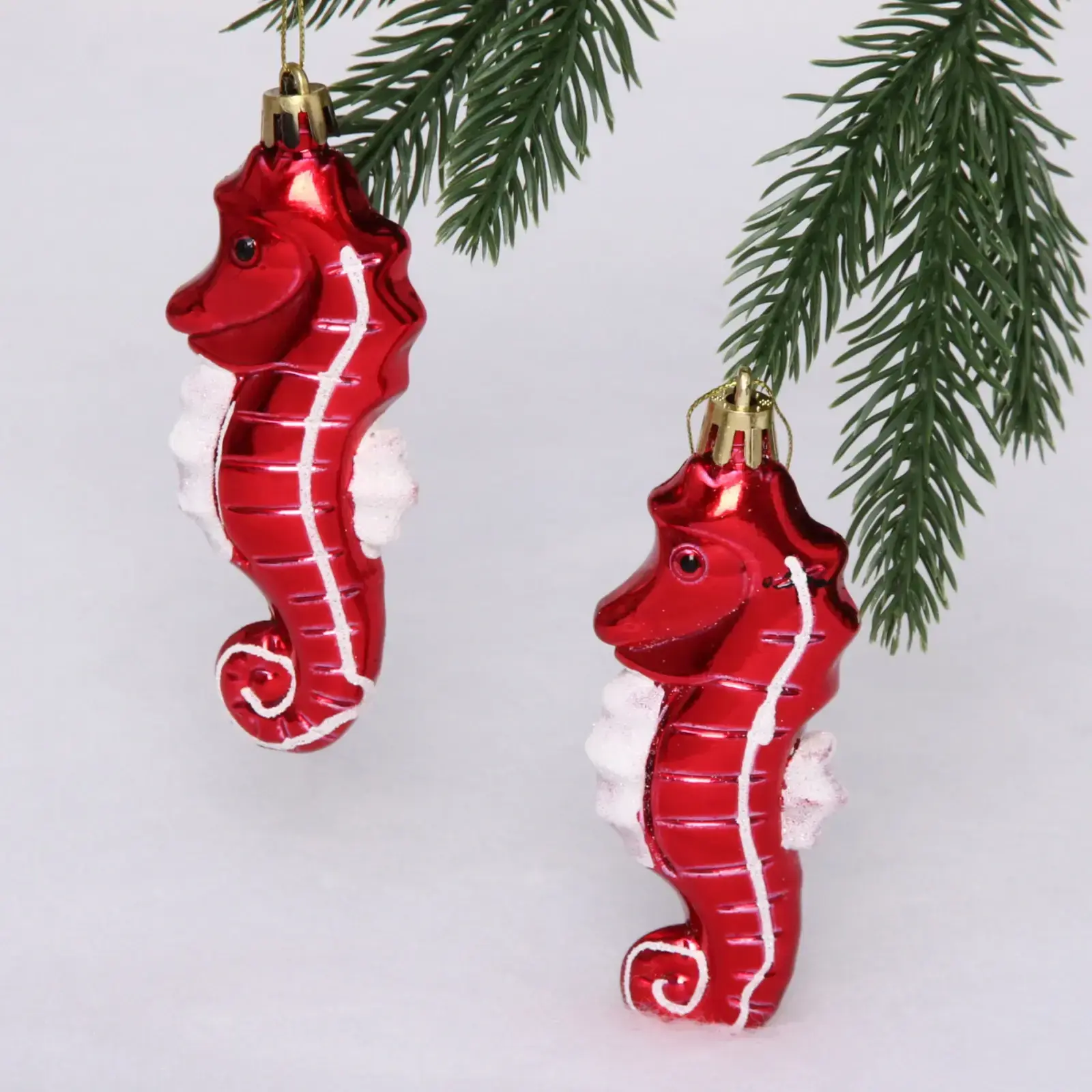 Эти яркие и блестящие елочные игрушки в форме морского конька добавят уникальности и очарования вашей новогодней елке. Их насыщенный красный цвет и детализированный дизайн привлекут внимание и создадут атмосферу праздника. Каждая игрушка оснащена золотистыми креплениями, что делает их легкими для подвешивания и удобными в использовании.