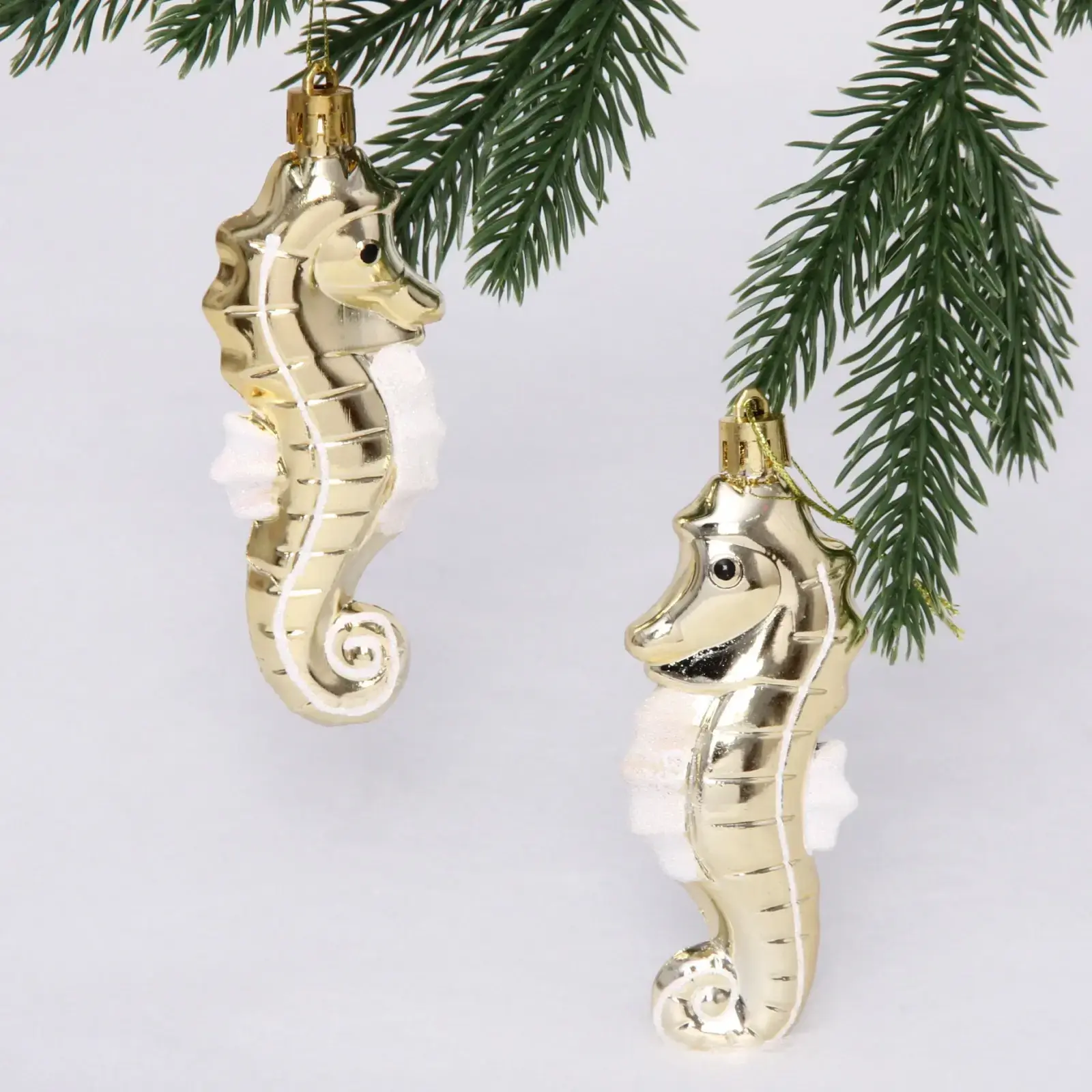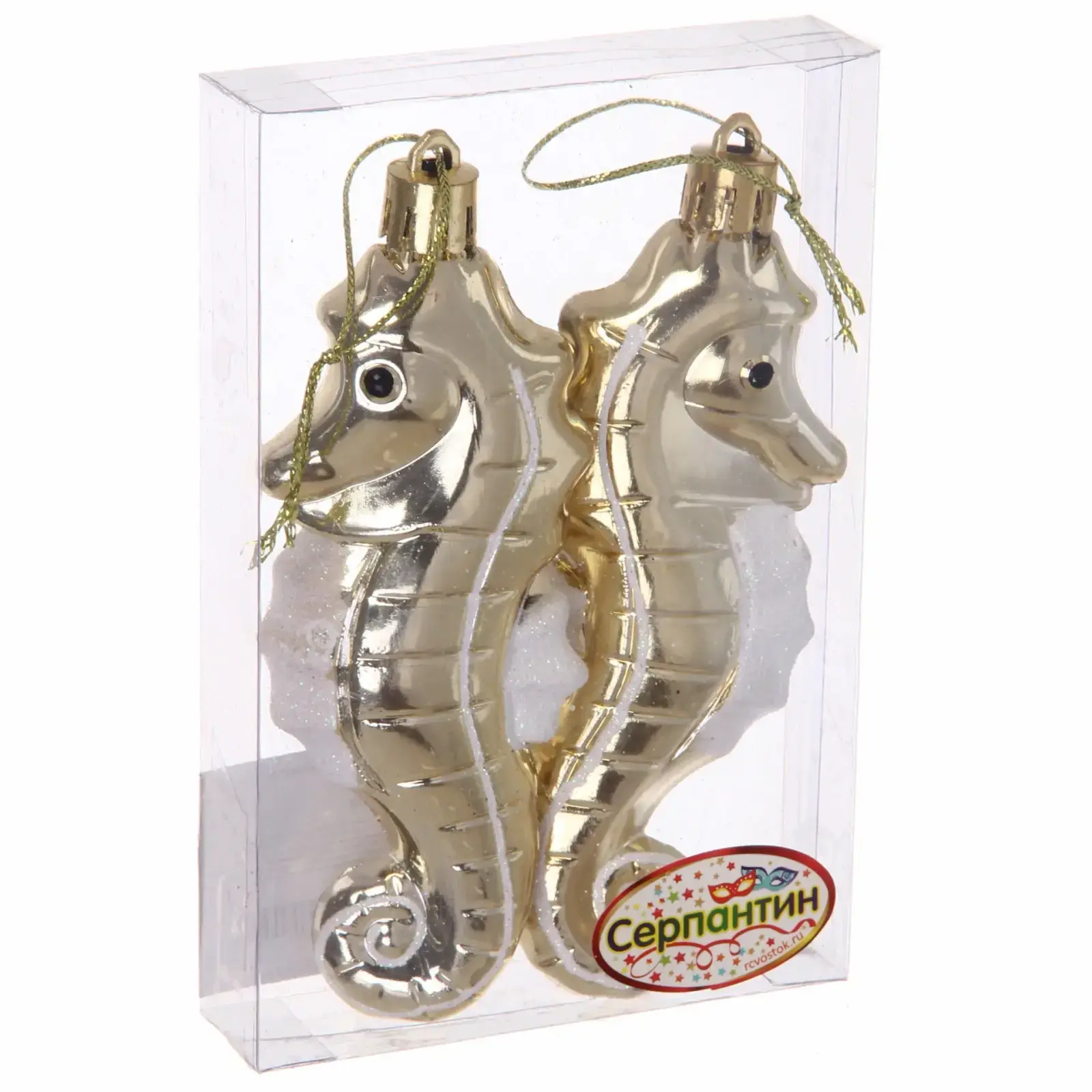 Эти великолепные елочные игрушки в форме морского конька добавят изысканности и очарования вашему новогоднему декору. Их золотистый цвет с блестящей поверхностью и белые акценты создают атмосферу праздника и радости. Подвешенные на вашей елке, они будут привлекать внимание и вызывать восхищение у гостей.