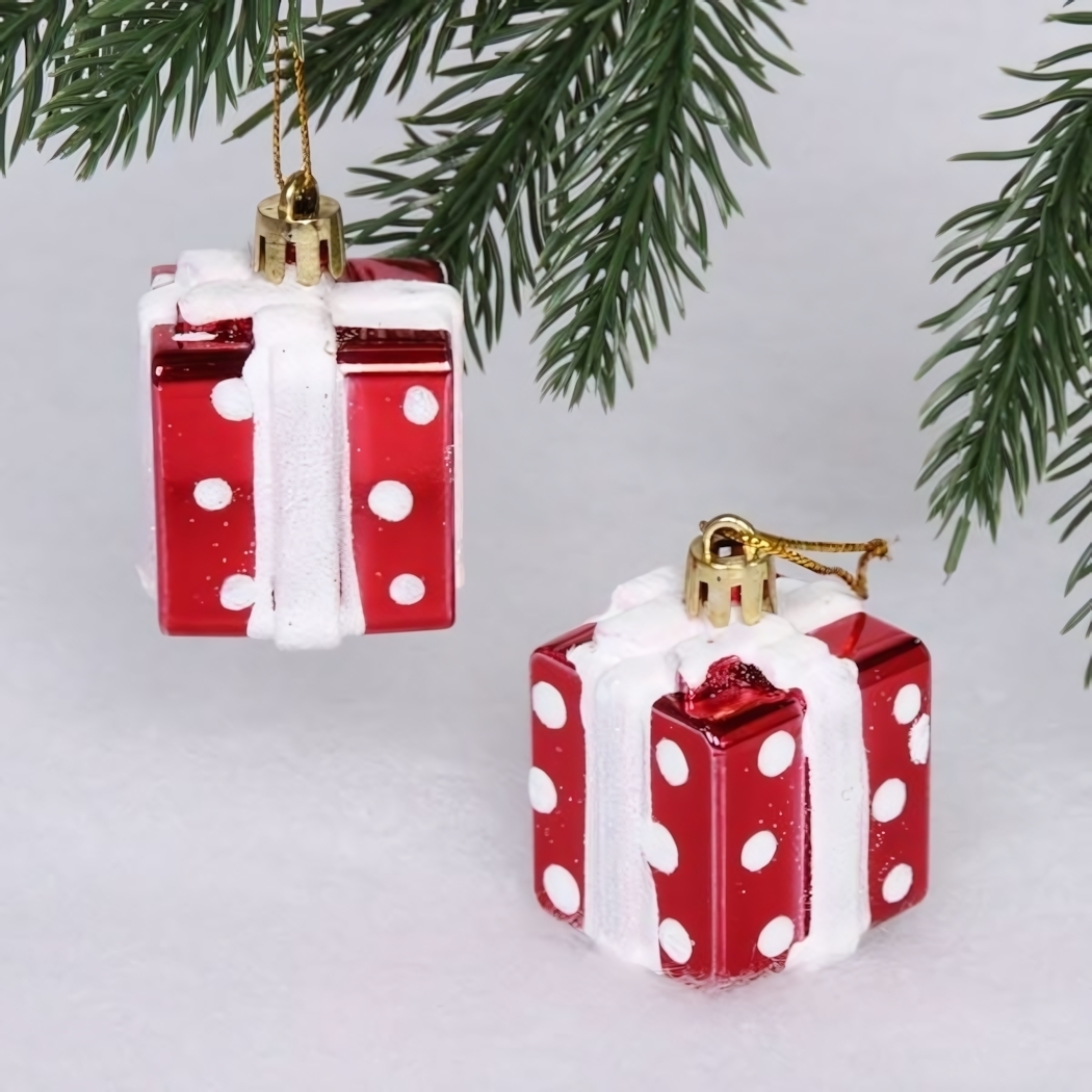 В упаковке 2 штуки, что позволяет оформить сразу несколько участков елки или композиции. Цвет — красный с белыми горохами, оформление в виде подарочной коробки с лентой. Украшения станут приятным дополнением к традиционным шарам и гирляндам, подчеркнув индивидуальный стиль вашего праздника.
