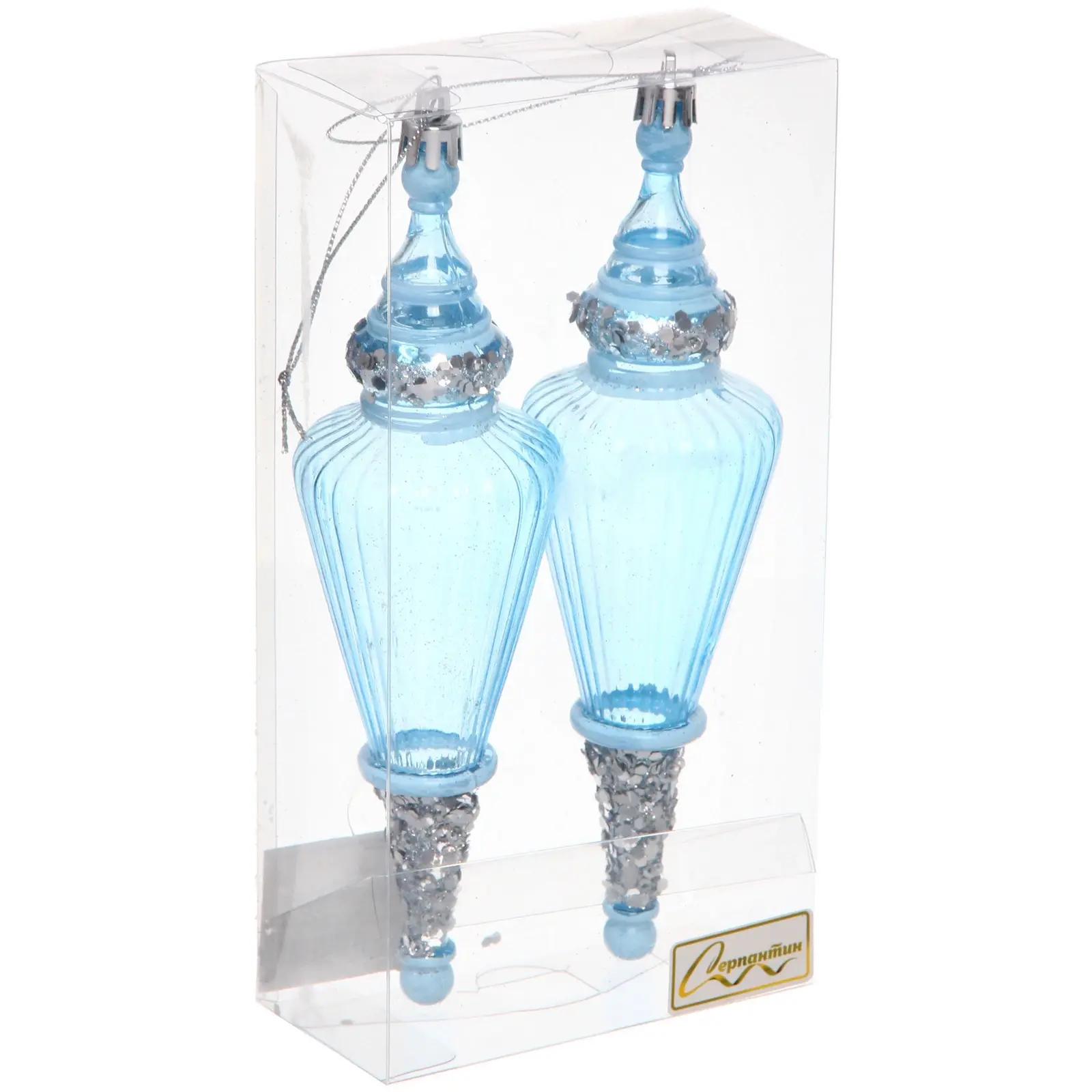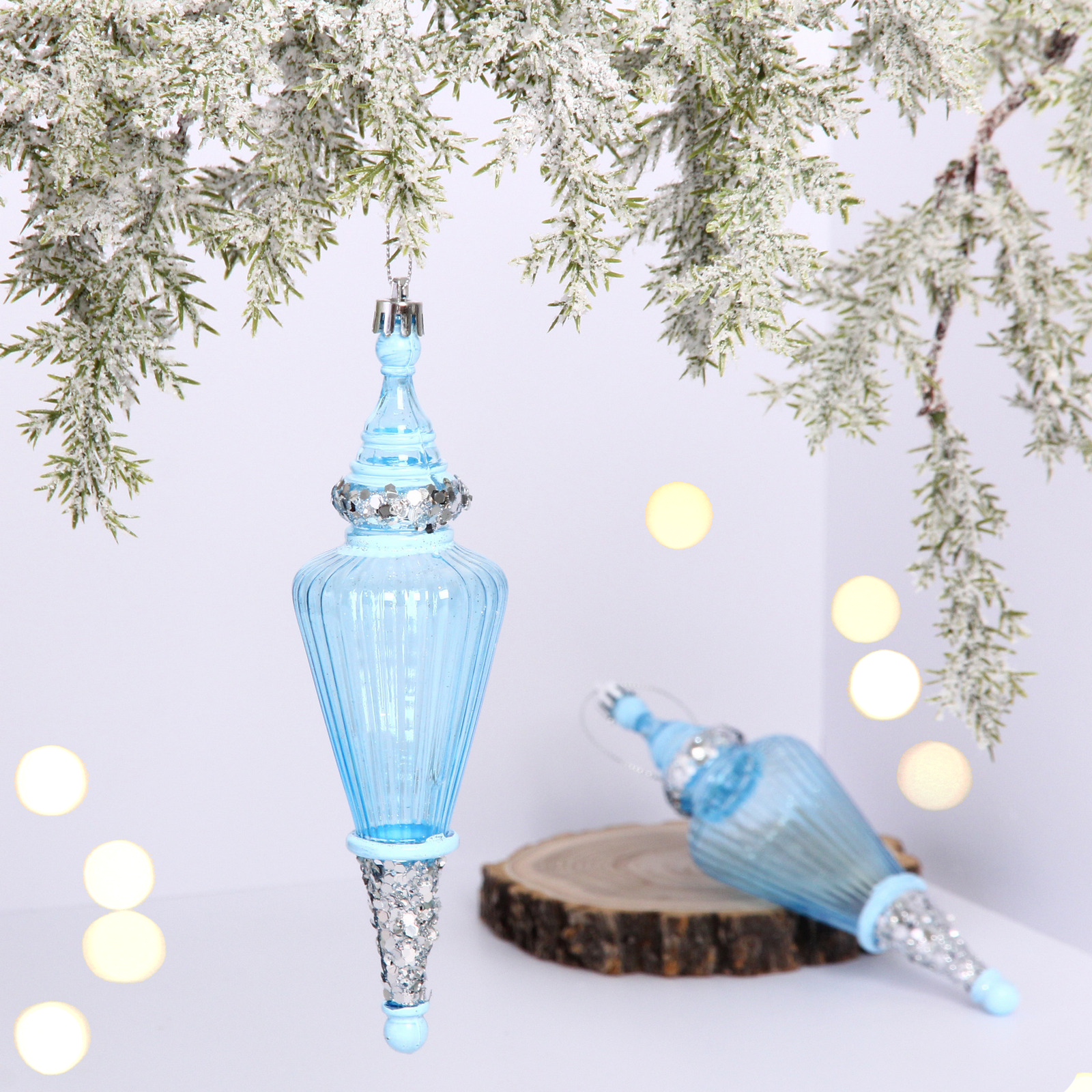 Добавьте утончённости и блеска вашей новогодней ёлке с набором из двух декоративных игрушек «Сияющий кристалл». Их вытянутая форма, прозрачный голубой оттенок и сверкающие серебристые элементы создают ощущение ледяной роскоши, которое гармонично впишется в любые праздничные композиции.