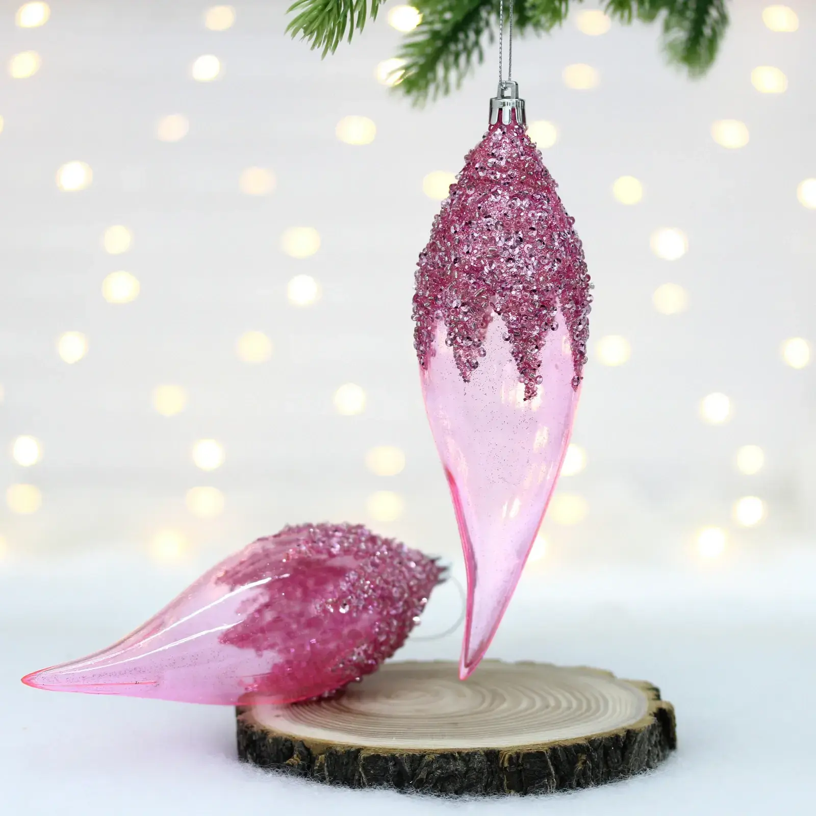 Игрушки имеют вытянутую форму, напоминающую сосульки, и прекрасно подойдут для декорирования как живой, так и искусственной елки. Они легко подвешиваются благодаря металлическому кольцу на верхушке, что делает процесс украшения простым и приятным. Эти игрушки также могут стать отличным подарком для ваших близких, добавляя в их дом атмосферу праздника.