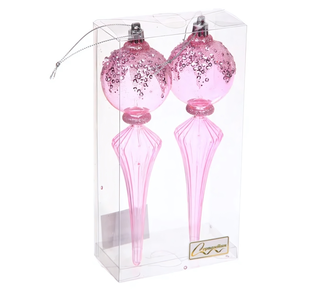 Высота каждого украшения — примерно 19 см, что позволяет использовать их как для основной зоны декора, так и для нижних и верхних ярусов. Материал визуально имитирует стекло, однако по ощущениям может быть пластиковым, что делает их более устойчивыми к случайным ударам. Упаковка компактная, прозрачная, подходит для аккуратного хранения.