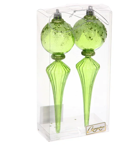 Размер каждого украшения составляет примерно 5.3 см в ширину и 19 см в высоту. Выполнены из стекла или аналогичного прозрачного материала с текстурированными пузырьками внутри. Украшения крепятся с помощью металлической петли, что делает подвешивание простым и надежным. Поставляются в прозрачной упаковке, защищающей от повреждений при хранении и транспортировке.