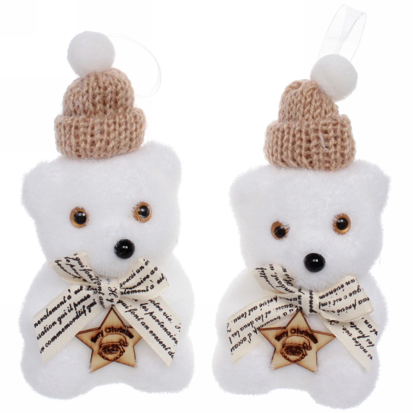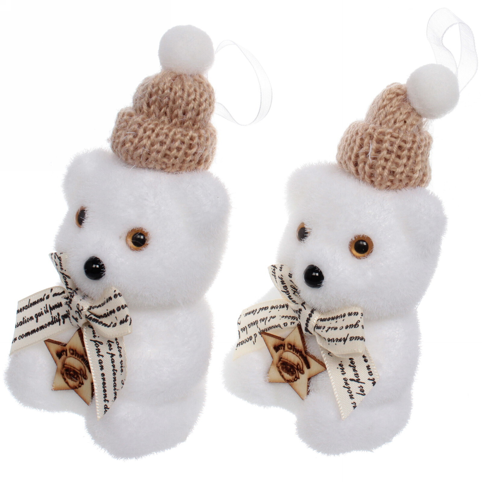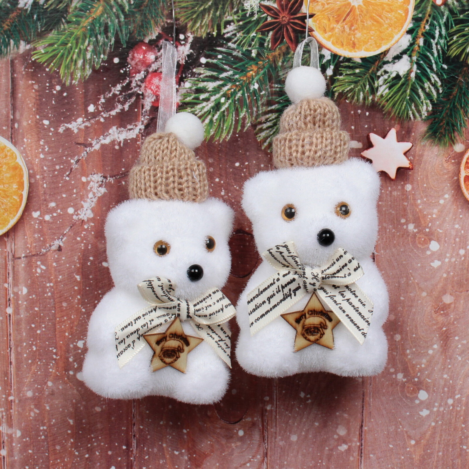 Каждое украшение выполнено в нежных тонах и украшено вязаной шапочкой с помпоном, что придает им особый шарм. На шее медвежат завязан бантик с надписями, а спереди расположена деревянная звезда с изображением и текстом. Эти детали делают украшения не только красивыми, но и оригинальными.