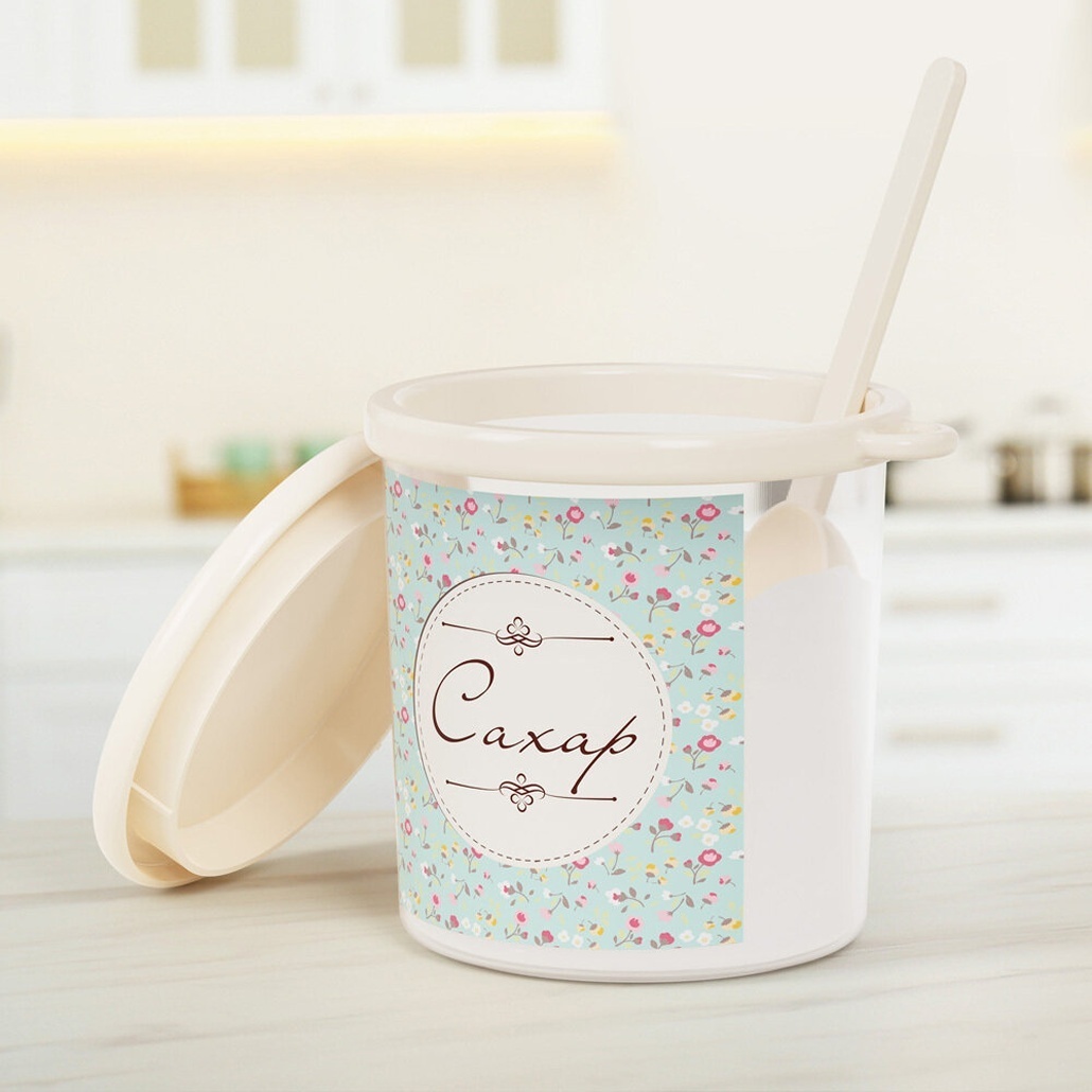 Емкость для сахара "Ассорти" объемом 0,7 литра — это идеальное решение для хранения сыпучих продуктов. Она выполнена из качественного прозрачного пластика, что позволяет легко контролировать количество сахара внутри. Элегантный дизайн с тематической наклейкой и светло-голубой крышкой добавляет стиль в вашу кухню, а мерная ложка, входящая в комплект, делает использование емкости еще более удобным.