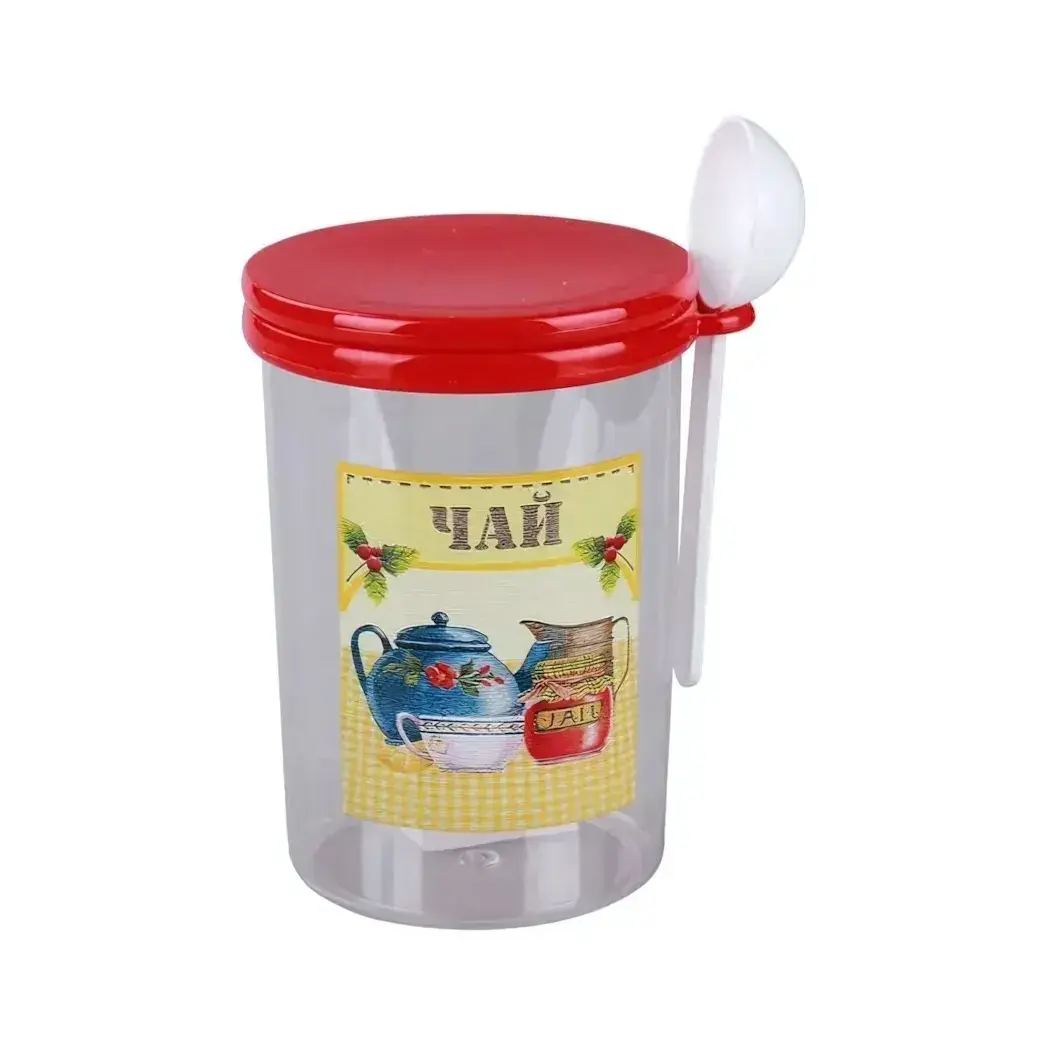 Емкость для чая "Ассорти" 1л с ложкой и крышкой, прозрачный пластик, цвет крышки в ассортименте