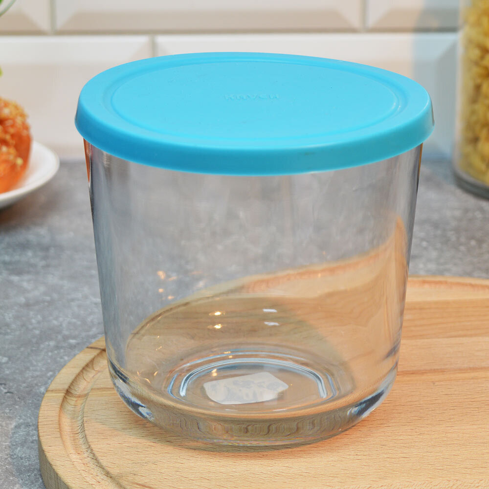 Эта прочная емкость из прозрачного стекла с герметичной голубой крышкой создаёт идеальные условия для хранения ваших продуктов. Цилиндрическая форма и утолщённое дно обеспечивают устойчивость, а плоская крышка плотно прилегает, сохраняя свежесть содержимого и предотвращая попадание влаги или запахов.