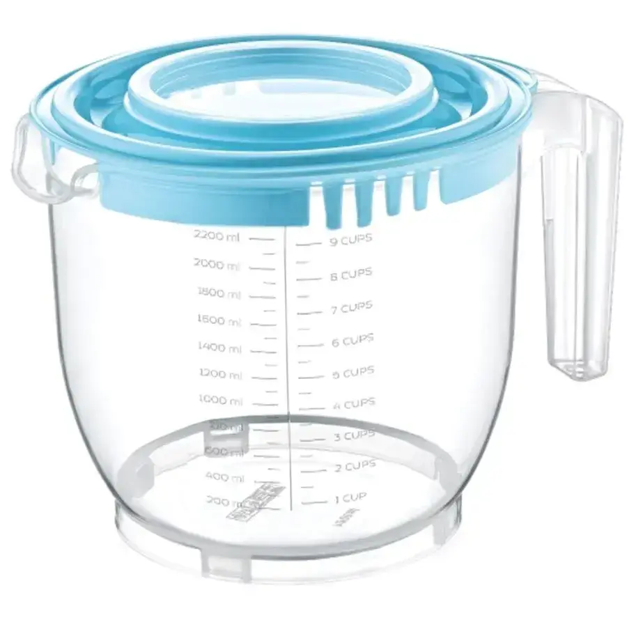 Прозрачная мерная чаша с герметичной крышкой и удобной ручкой станет незаменимым помощником при приготовлении коктейлей, соусов и выпечки. Объём 2200 мл с двойной шкалой измерений (миллилитры и чашки) позволяет точно дозировать ингредиенты.