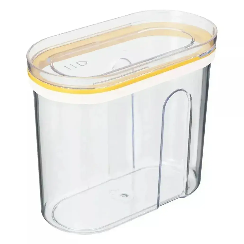 Объём 1 литр оптимален для хранения стандартных упаковок продуктов. Изготовлен из безопасного пищевого пластика, устойчивого к деформации. Жёлтая крышка с белым слайдером создаёт контрастное сочетание, облегчающее визуальный поиск в шкафу.