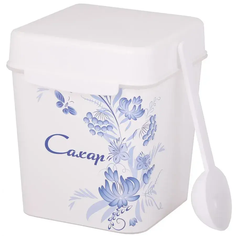 Контейнер имеет квадратную форму, что экономит место при хранении. Прозрачная маркировка 'Сахар' и декоративные элементы в синих тонах создают приятный визуальный акцент.