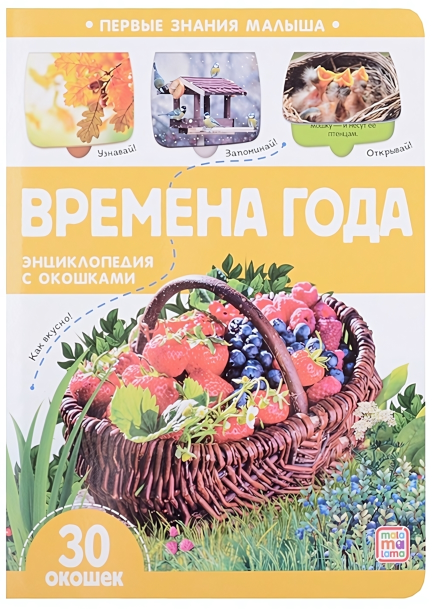 Погрузитесь в увлекательный мир природы с книгой 'Времена года' от Malamalama. Эта энциклопедия с окошками не только развлекает, но и обучает, позволяя вашему ребенку узнать о смене времен года, перелетных птицах и сезонных растениях. Яркие иллюстрации и фотографии делают процесс обучения интересным и увлекательным.