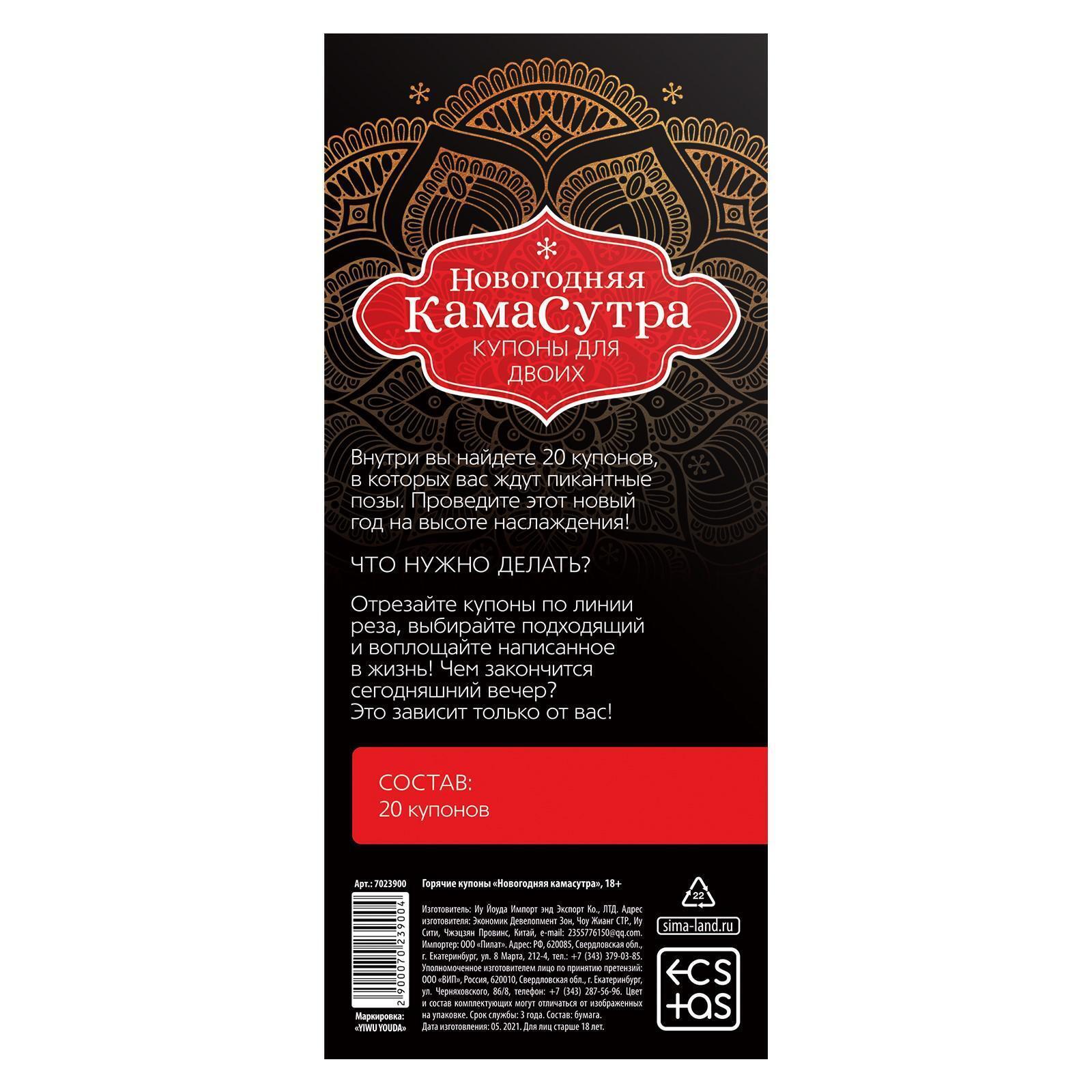Эротические купоны 'Новогодняя Камасутра' — это идеальный способ добавить пикантности в ваши отношения и сделать Новый год незабываемым. Внутри вы найдёте 20 уникальных купонов с захватывающими позами, которые помогут вам раскрыть новые грани интимной жизни. Каждый купон — это приглашение к приключению, которое вы можете осуществить в любое время, когда захотите.
