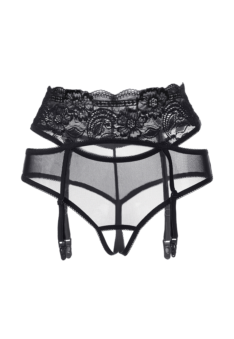 - Высокая кружевная талия: Широкий пояс из ажурного черного кружева с цветочным узором и волнистым краем визуально корректирует линию талии, создавая соблазнительный силуэт.
