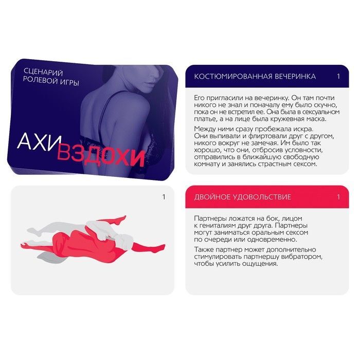Разделите карты на две колоды: «Сценарии ролевой игры» и «Секс-позы». По очереди вытягивайте карты, зачитывайте их содержание и воплощайте написанное в жизнь. Вы можете остановиться на одной карте или попробовать несколько сценариев подряд — главное, чтобы вы наслаждались процессом. Набор подходит как для пар, только начинающих свои отношения, так и для тех, кто уже давно вместе.