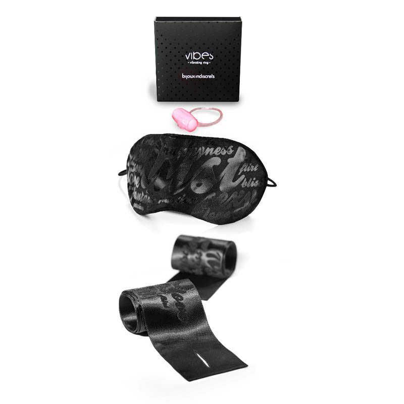 Цвет набора — черный, что придает ему элегантный и стильный вид. Маска и ленты изготовлены из тканевой основы, а виброкольцо имеет встроенную функцию вибрации, что добавляет дополнительный уровень удовольствия. Набор упакован в стильную коробку, что делает его отличным подарком для особого случая.