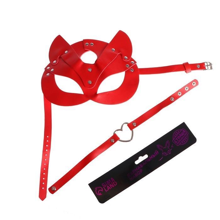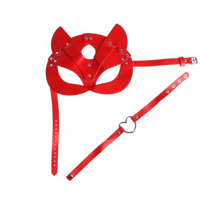 Маска и чокер выполнены из искусственной кожи и металла, что обеспечивает их прочность и долговечность. Красный цвет подчеркивает страсть и игривость, а декоративные элементы, такие как заклепки и сердечко, добавляют уникальности. Размеры маски и чокера регулируются, что позволяет легко подстроить их под индивидуальные особенности.