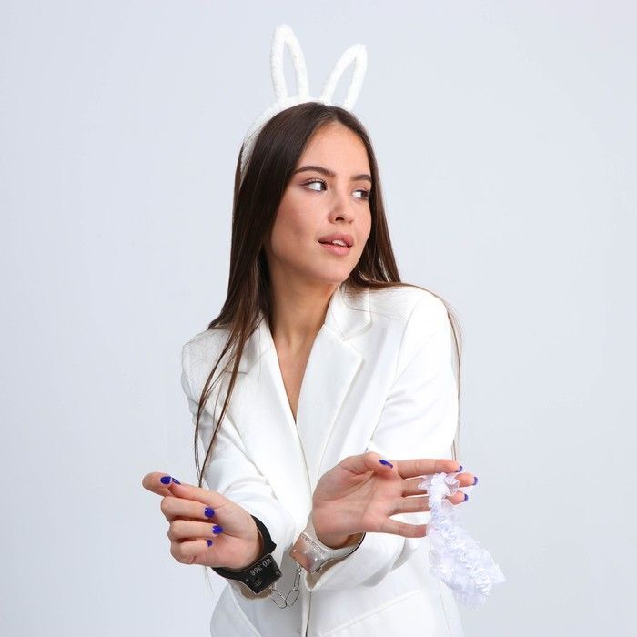 Эротический набор 'Я твоя зайка', белый/серебристый, ободок/наручники/повязка